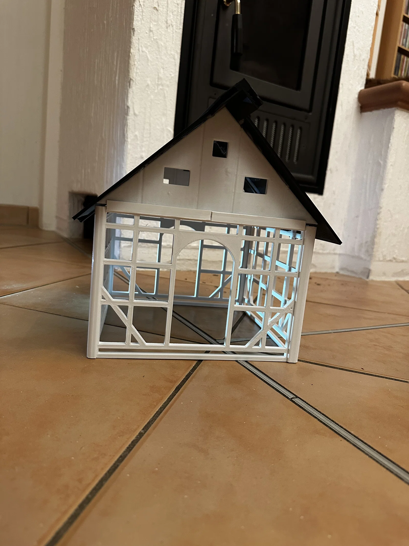Phần thân màu trắng cũng như phần mái được lắp kiểu cắm ghép. Kích thước: 23 x 23 cm, cao 27 cm, in bằng PLA trên Anycubic Kobra 2 Pro.
