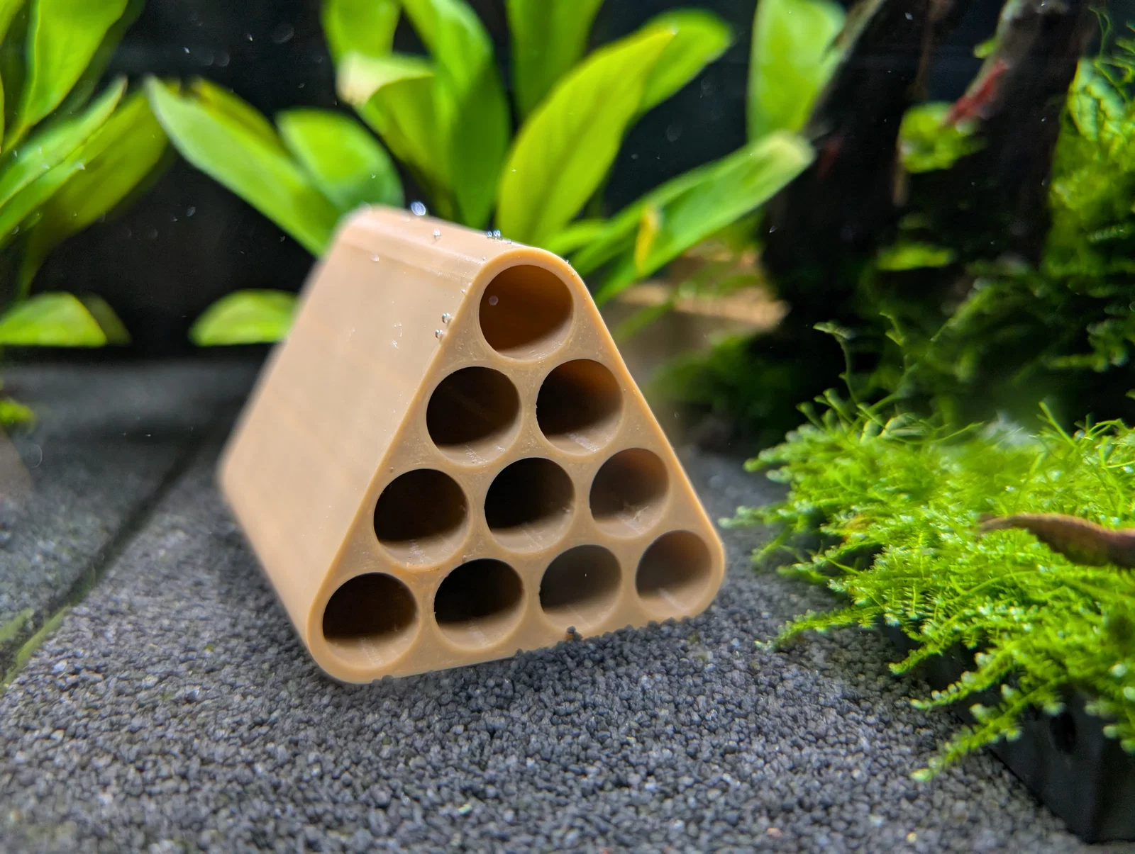 Hang trú ẩn cho tôm Shrimp Cave đơn giản mà hiệu quả. Kích thước 69×58×52.5mm. Khuyến nghị in 100% infill để không nổi; dùng PETG hoặc PLA, trong đó PETG bền và ổn định hơn khi ngâm nước lâu dài.