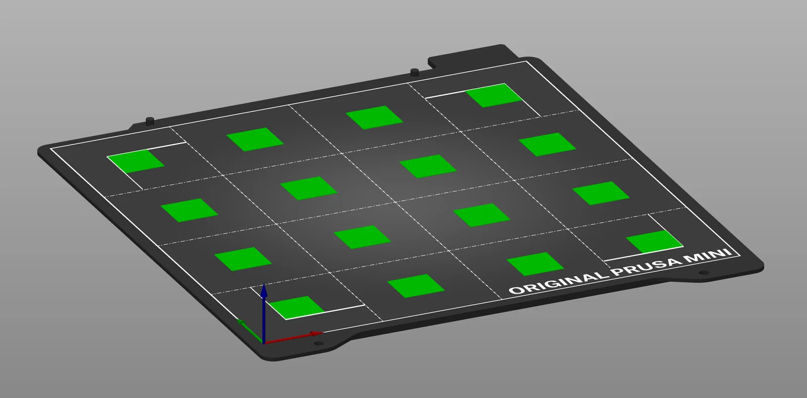 Calibration Matrix cho Prusa Mini để canh chỉnh first layer. Gồm các ô 15×15mm cao 0.2mm, sắp theo ma trận 4×4 và in tuần tự. Dùng Live-Z tuning để chỉnh thô rồi tinh chỉnh theo từng ô in ra.