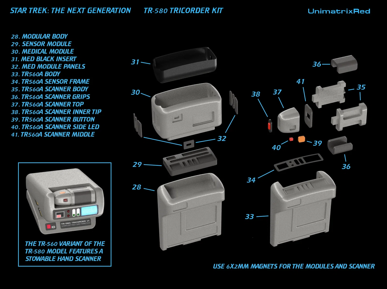 Bộ kit Tricorder TR-580 theo các mùa sau của Star Trek: The Next Generation. Có thể làm bản science tiêu chuẩn hoặc đổi sang medical bằng nam châm để thay module. Kèm graphics, display stand và belt holster.