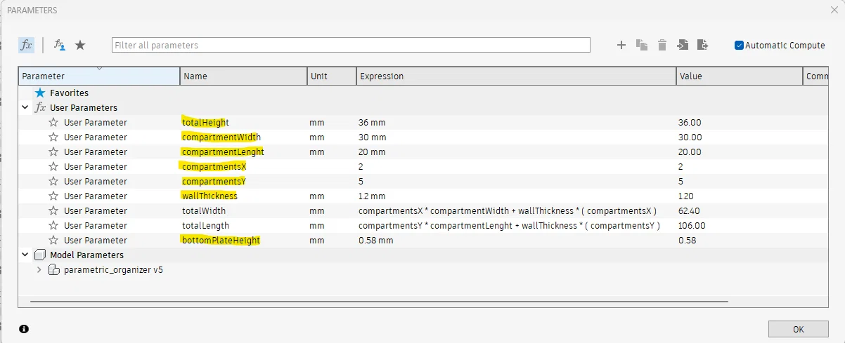 File Fusion 360 dạng parametric cho khay chia ngăn. Mình dùng để xếp sơn móng tay nhưng bạn có thể dùng cho nhiều mục đích khác. Tùy chỉnh số ngăn, kích thước, chiều cao và độ dày thành theo nhu cầu.
