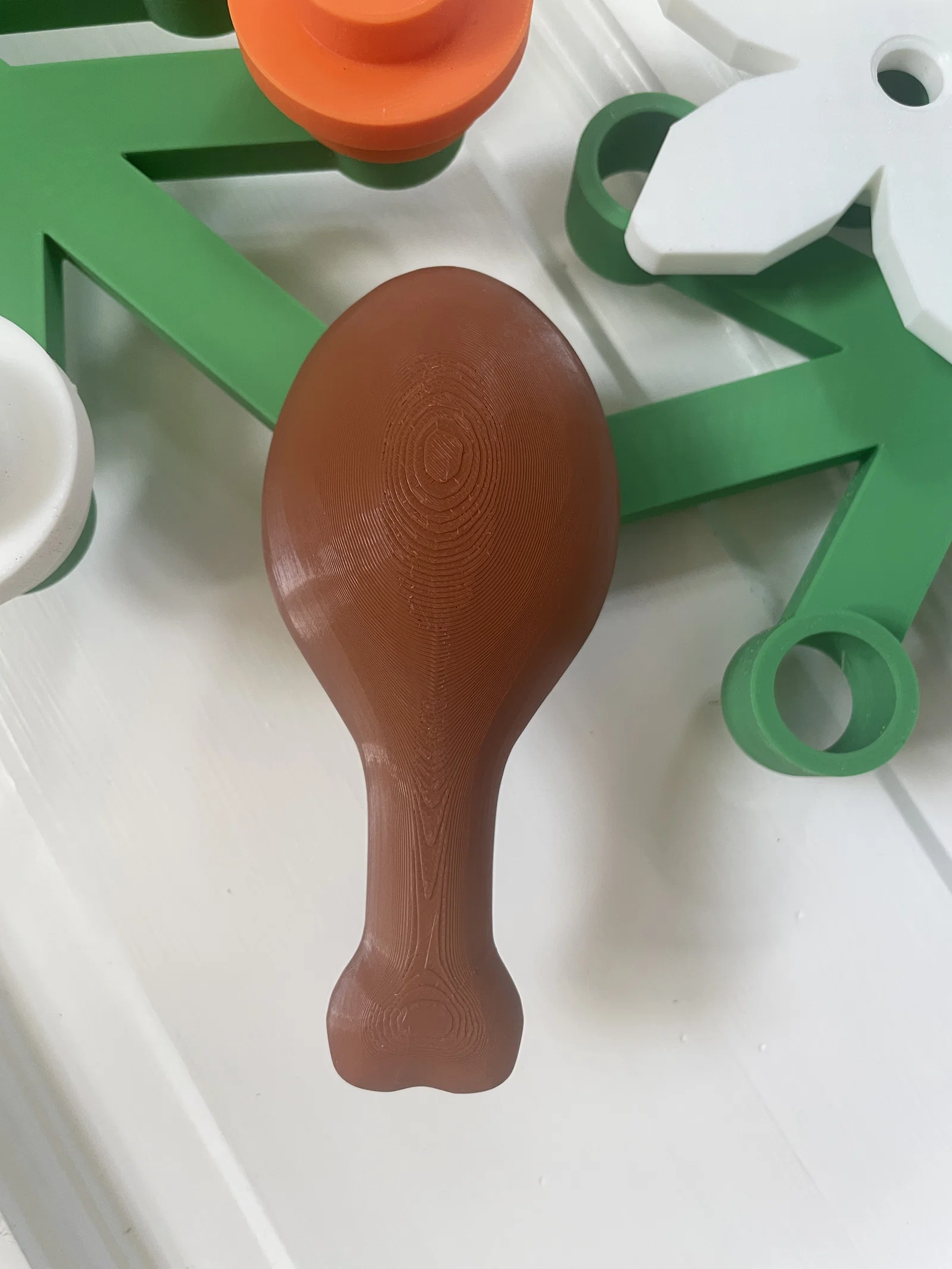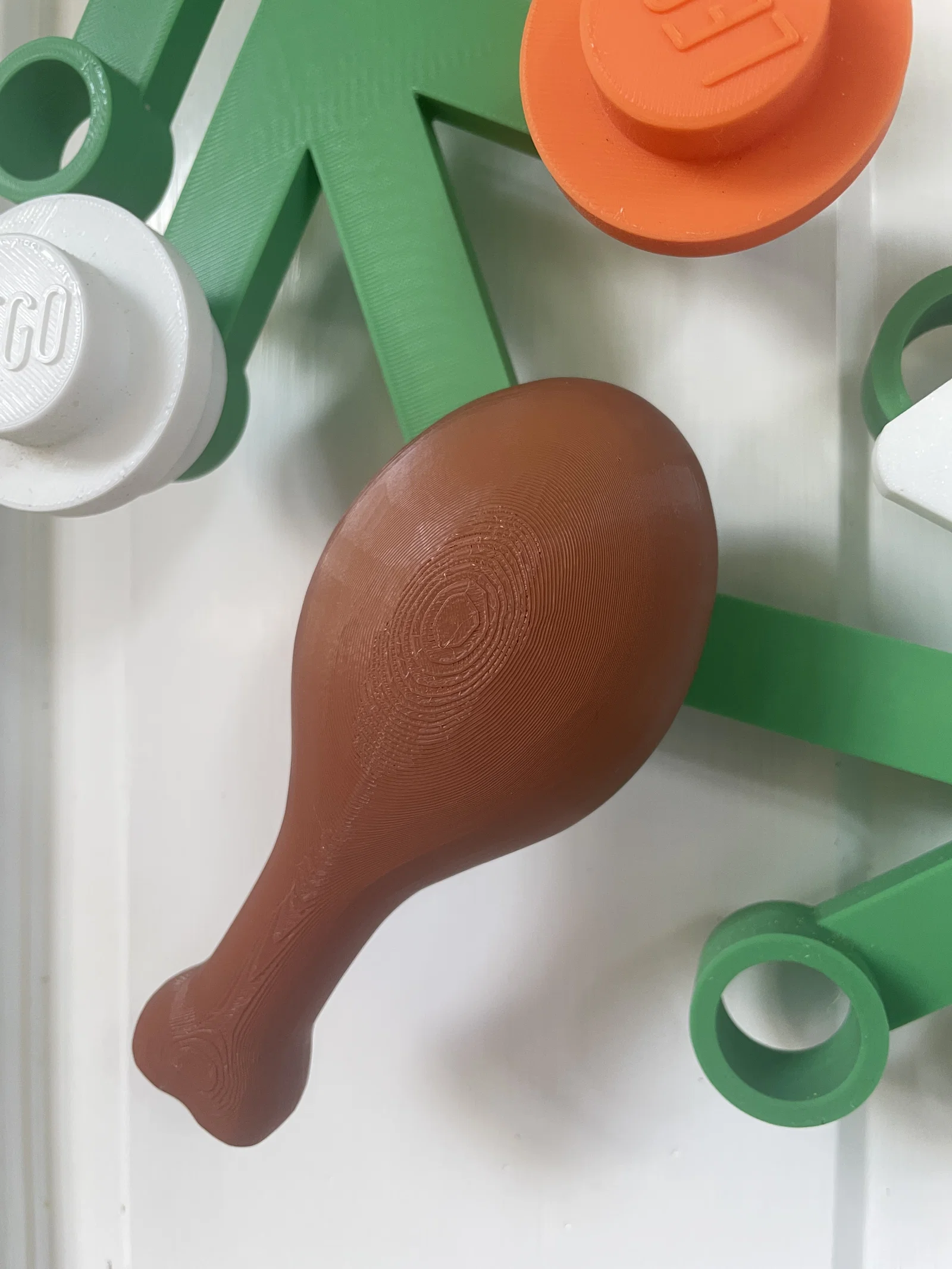 Đùi gà tây “Lego wreath turkey leg” cho vòng hoa Lego khổng lồ, làm kịp mùa Thanksgiving. Thiết kế bám theo kiểu gạch Lego và tối ưu để in 3D không cần support, đồng bộ với các mảnh wreath khác.