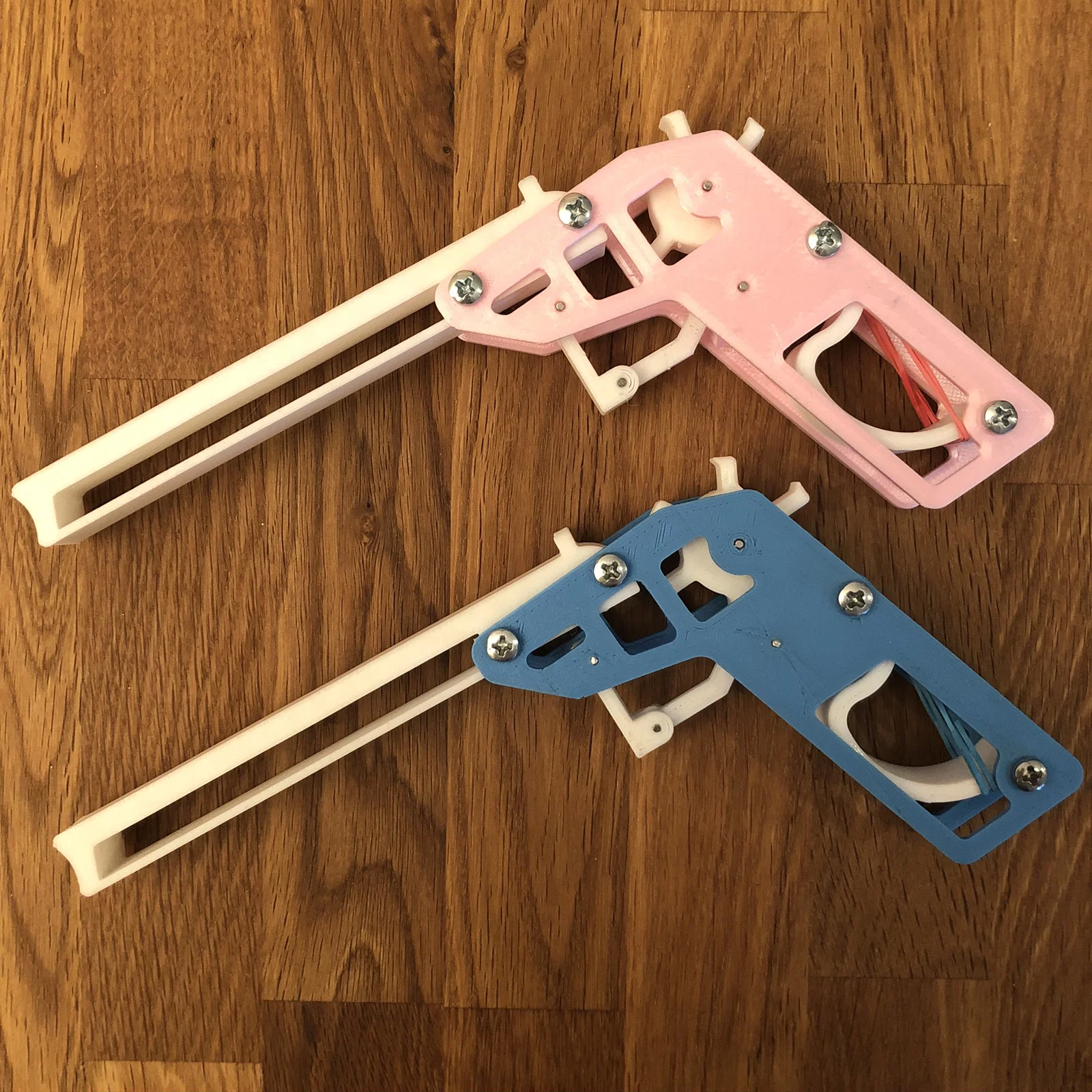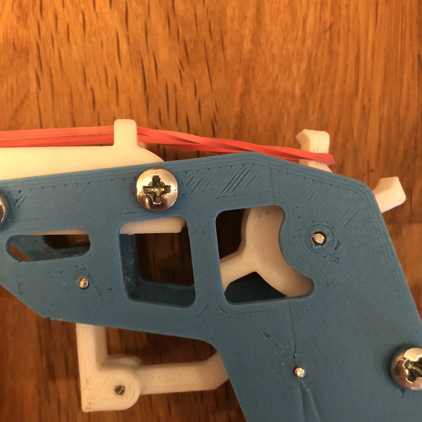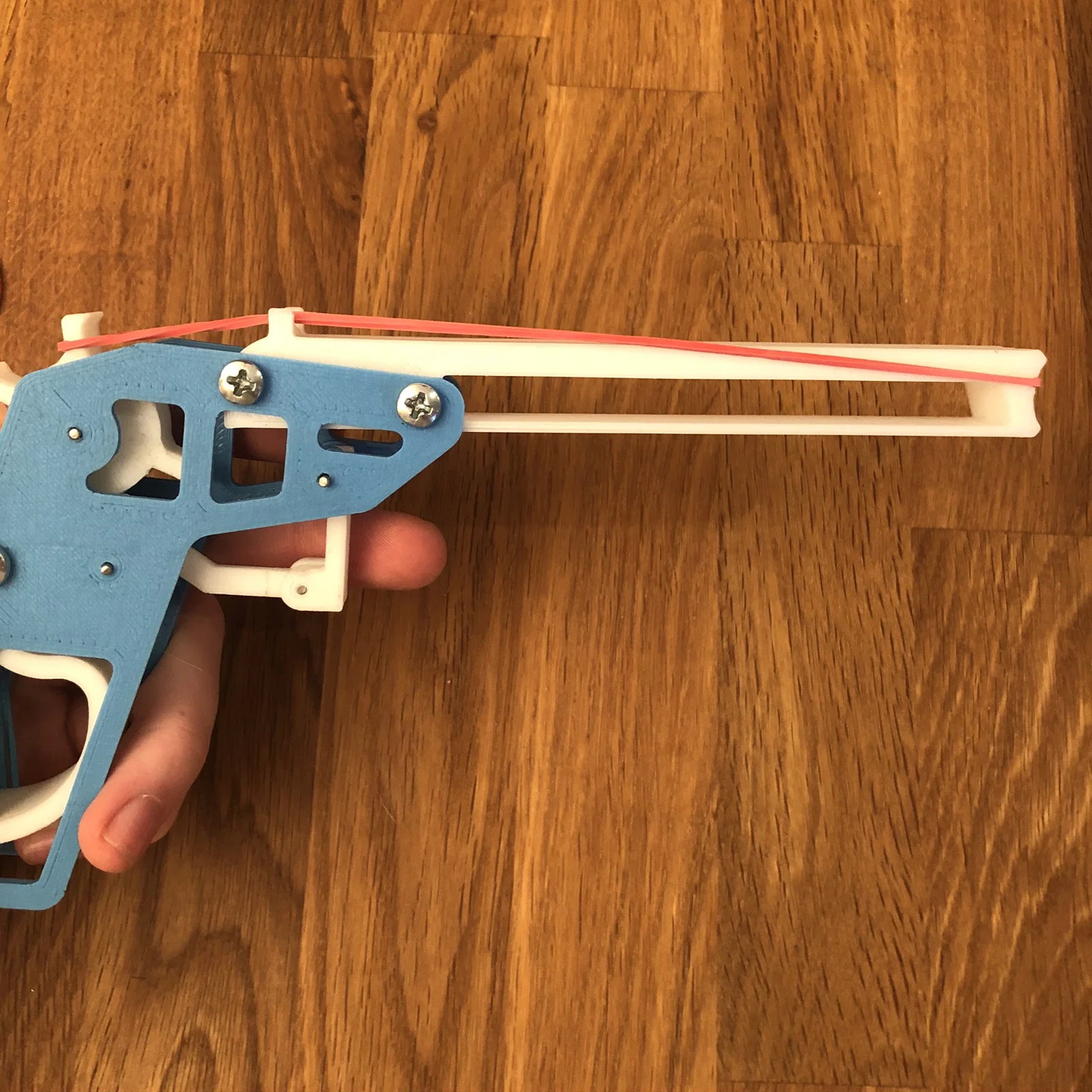 Mẫu súng bắn dây thun 6 phát, thiết kế để in 3D và lắp ráp bằng ốc M4x10 cùng chốt/đinh 2mm. Tải file barrel_fixed.stl kèm theo, in PLA với layer 0.2–0.3mm; một số chi tiết cần support và dán keo khi lắp.