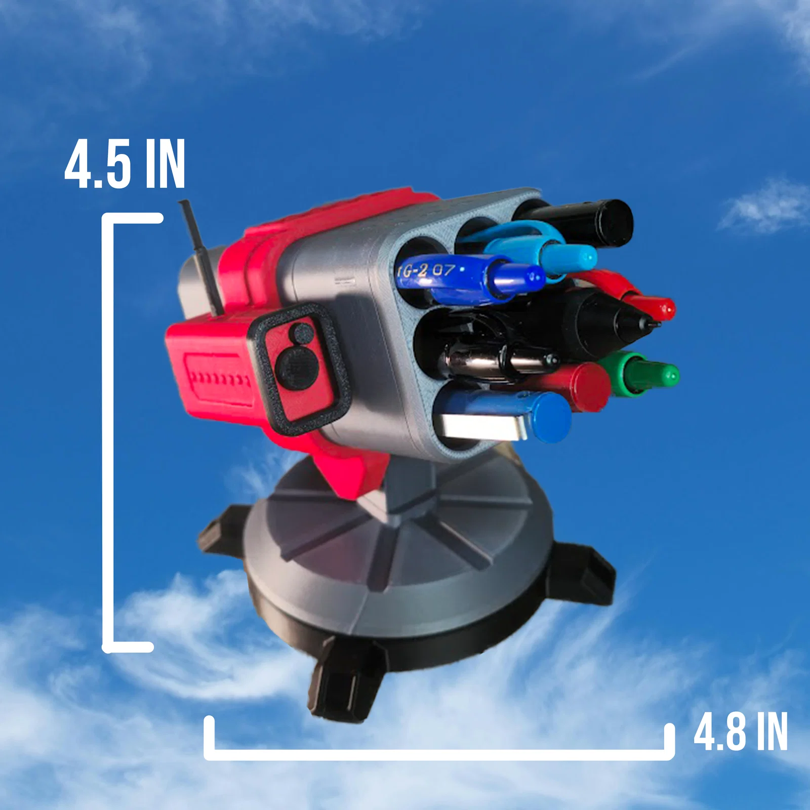 Sản phẩm này cho phép bạn cắm tối đa 6 cây bút khác nhau vào các hốc chứa, giữ cho không gian làm việc luôn ngăn nắp. Điểm đặc biệt khiến ai cũng thích thú chính là khả năng xoay và quay linh hoạt của bệ phóng. Mỗi khi cần ghi chú hoặc trong những lúc làm việc căng thẳng, bạn có thể xoay bệ tên lửa để thay đổi hướng nhìn, mang lại cảm giác như một chỉ huy đang canh gác trên chiến trường ngay tại bàn làm việc của mình.