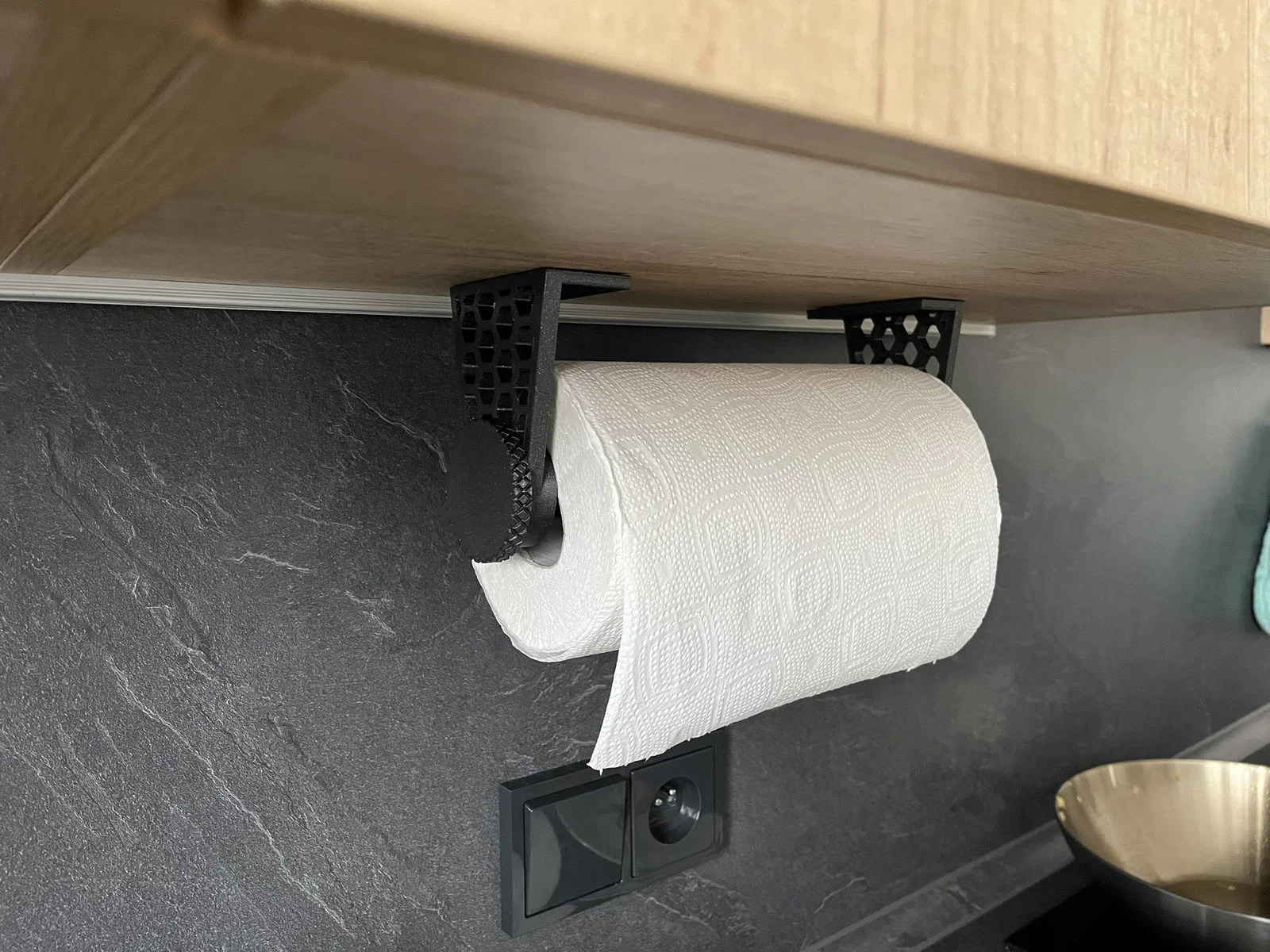 Giá treo khăn giấy đơn giản, có thể gắn bằng băng keo 2 mặt. Cần in 2 screw và 2 holder; nếu screw bị cấn/không vừa, thử scale trục X/Y xuống 97–99% (tùy vật liệu PLA và dung sai).