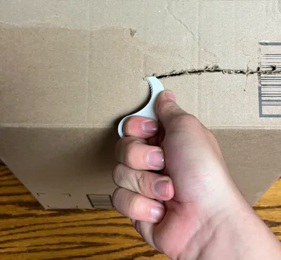 The Raptor Saw là phiên bản dao rọc thùng (box cutter) có thêm răng cưa để cưa xuyên qua bìa carton dễ hơn. Nếu bạn thuận tay trái, chỉ cần mirror model trong slicer là dùng được.