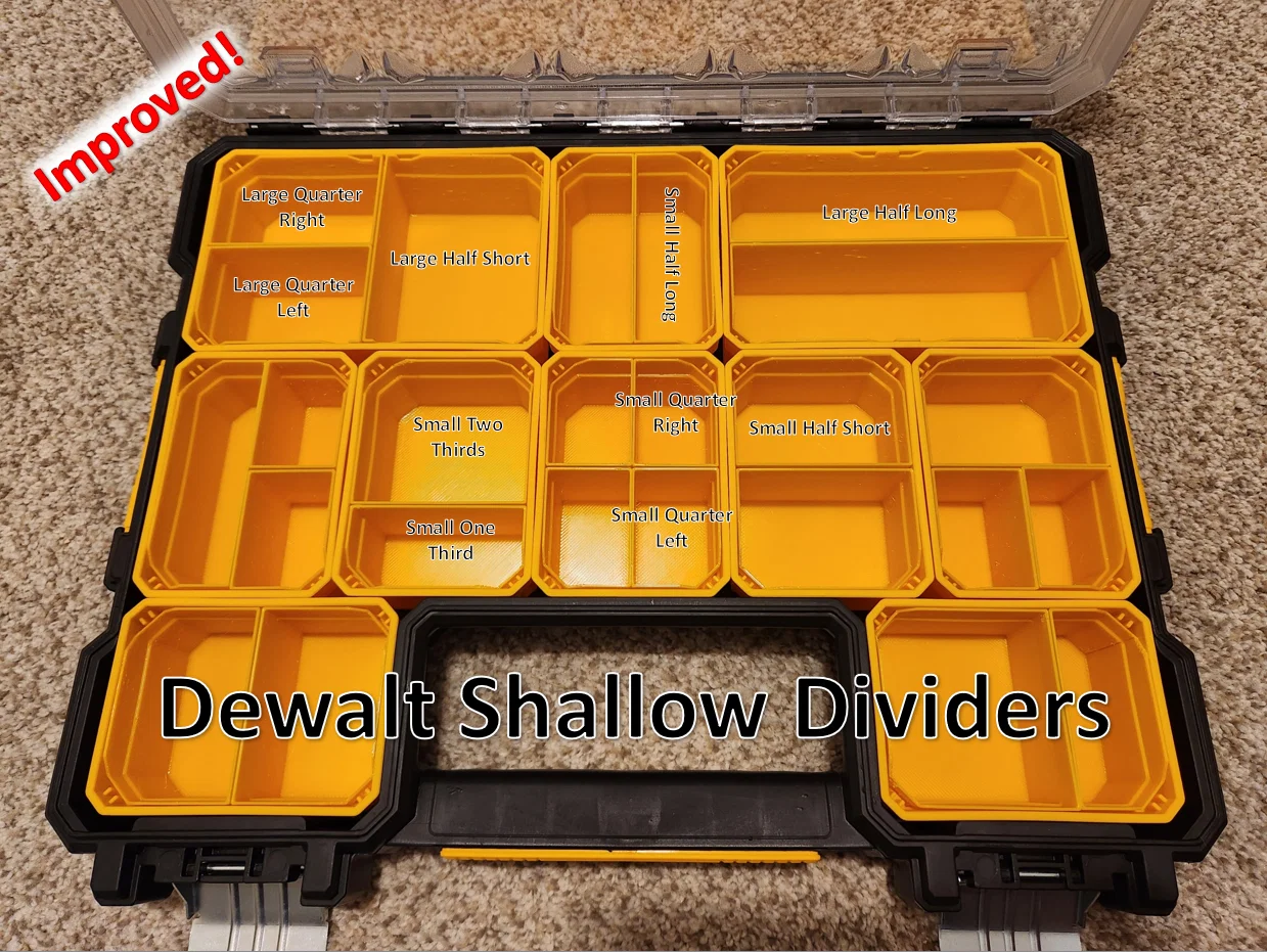Insert vách ngăn cho Dewalt Pro Shallow Organizer, có khoét tránh gờ định vị trên nắp để đóng kín phẳng hơn. Có thêm insert cho ngăn lớn; bản cũ vẫn giữ lại để scale và chồng đôi, nhưng bản mới có thể kém stack hơn.