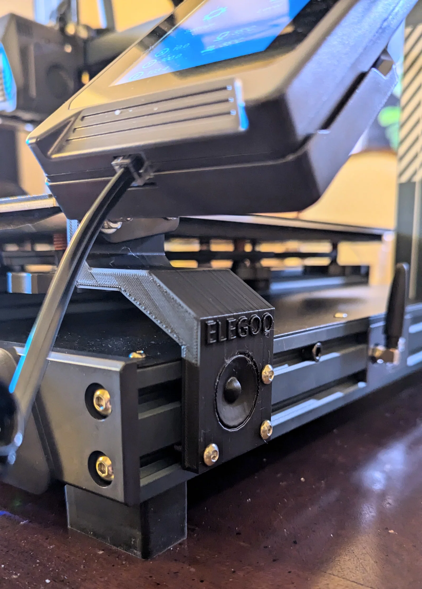 Bề mặt được trang trí giả lập loa và có logo/branding Elegoo.
