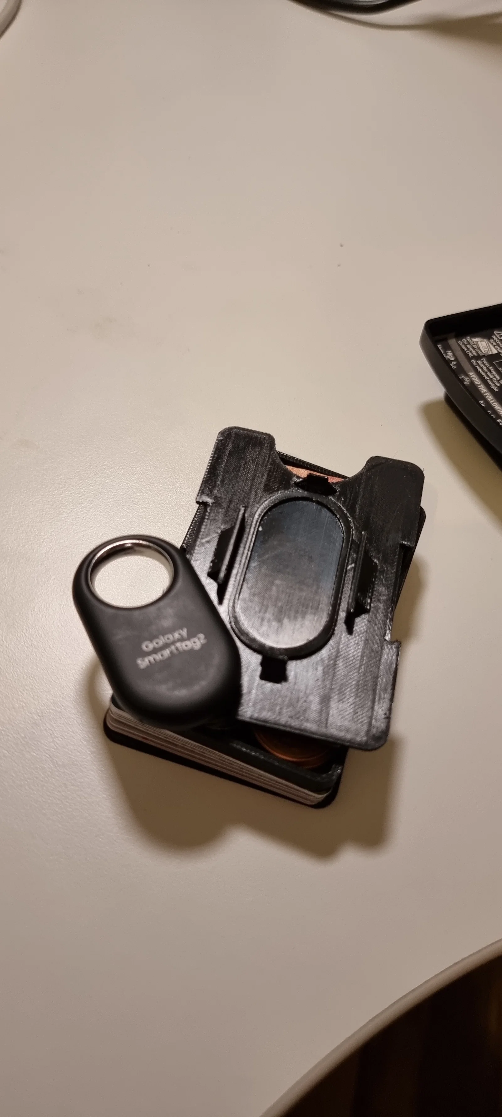 Mẫu tấm giữ/holder để gắn Samsung SmartTag 2 lên Lockcard Wallet. In thử với filament PETG, nozzle 0.4 trên máy X1C và không cần supports, phù hợp làm phụ kiện GPS theo dõi cho ví.