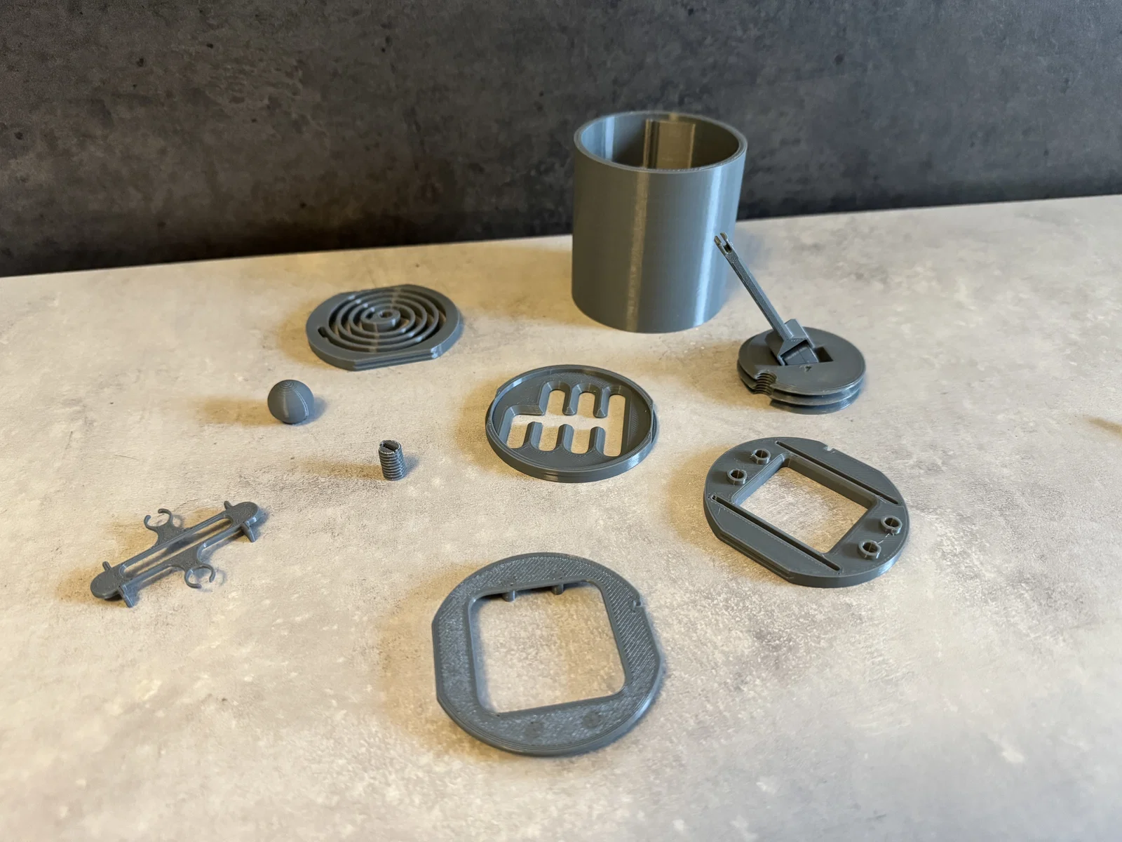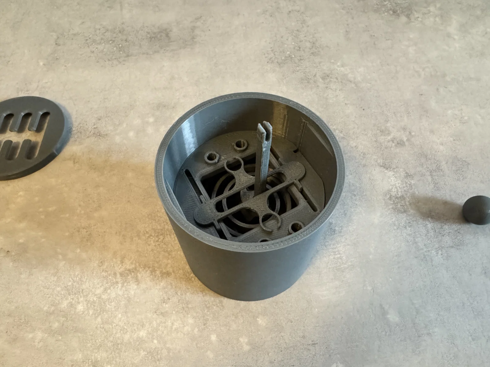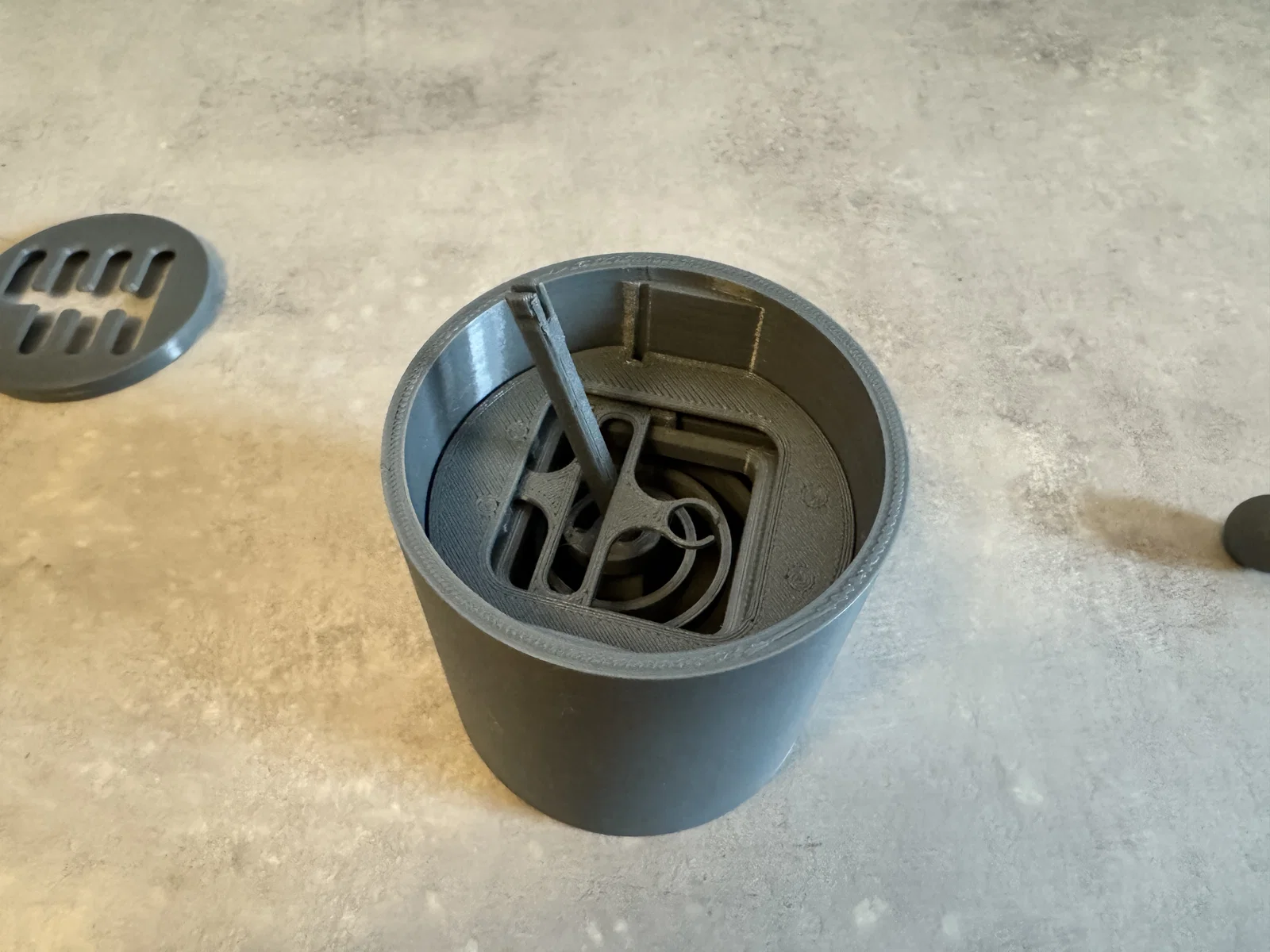 Vậy nên mình quyết định làm phiên bản riêng của một gear shifter fidget. Mình thiết kế để có lò xo (spring) đưa cần số về giữa và có cơ chế khóa để giữ ở từng số. Đường kính của fidget được làm bằng với lon 330ml, nên có thể để vừa trong khay để ly (cup holder).