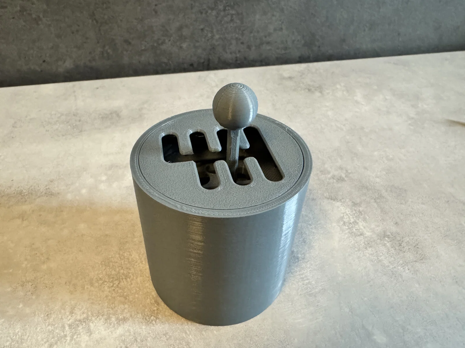 Đồ chơi fidget mô phỏng cần số gated trên xe, có spring hồi về giữa và cơ chế khóa theo từng số. Kích thước tương đương lon 330ml để vừa cup holder. Đã test in PLA/PETG; PLA nên để neutral khi cất.