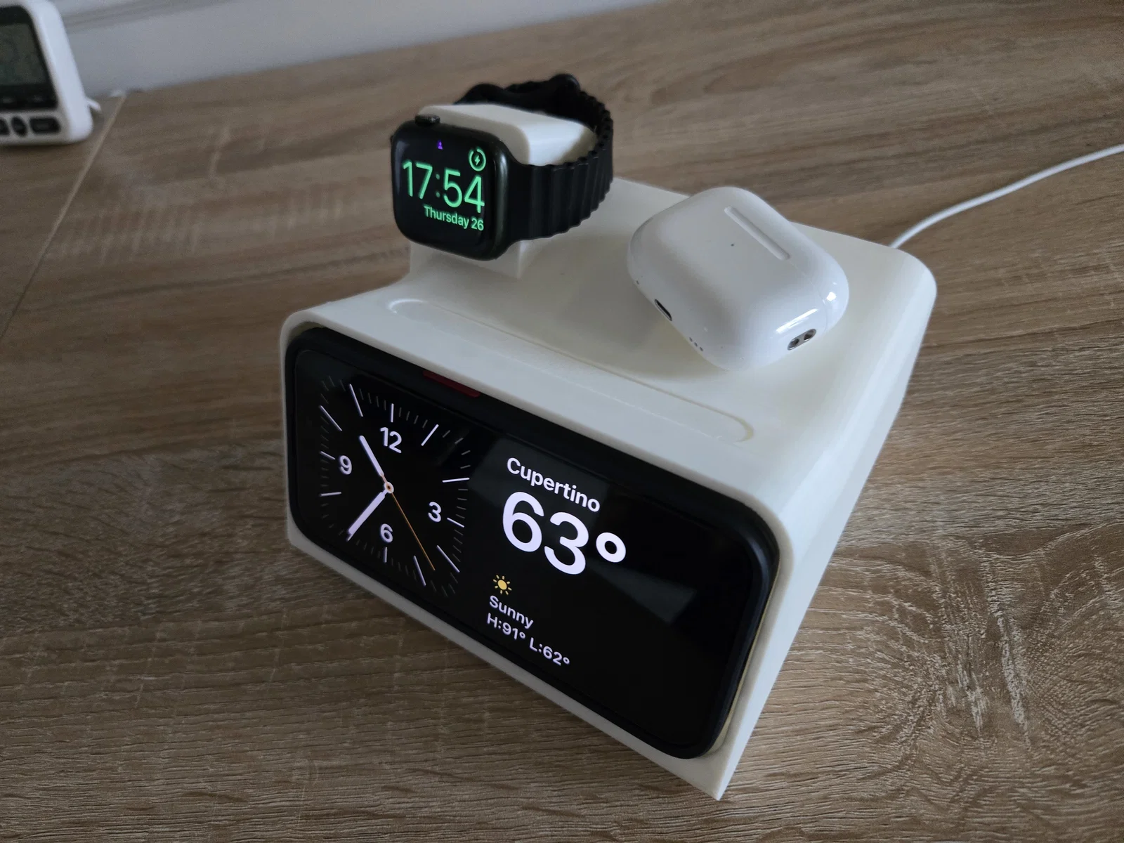Bản mod của iPhone Standby Dock (Scott Yu-Jan), bổ sung thêm 1 Apple Watch Puck để đặt/sạc cùng lúc 3 thiết bị: iPhone (mọi bản không Max), Apple Watch và AirPods—miễn là đều dùng MagSafe.