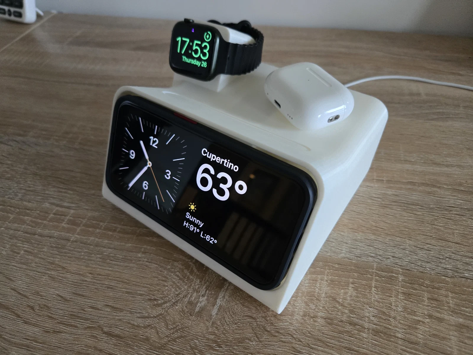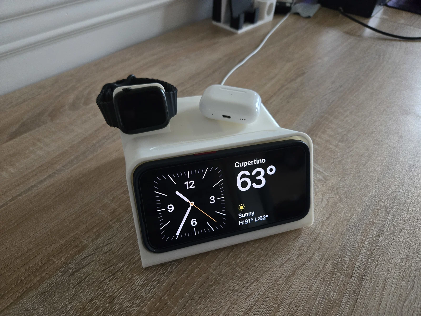 Đây là một bản chỉnh sửa từ iPhone Standby Dock của Scott Yu-Jan, thêm một Apple Watch Puck nữa để gắn vừa 3 thiết bị: iPhone (tất cả mẫu không phải Max), Apple Watch và AirPods, với điều kiện là cả 3 đều dùng MagSafe. Dưới đây là mô tả của tác giả: