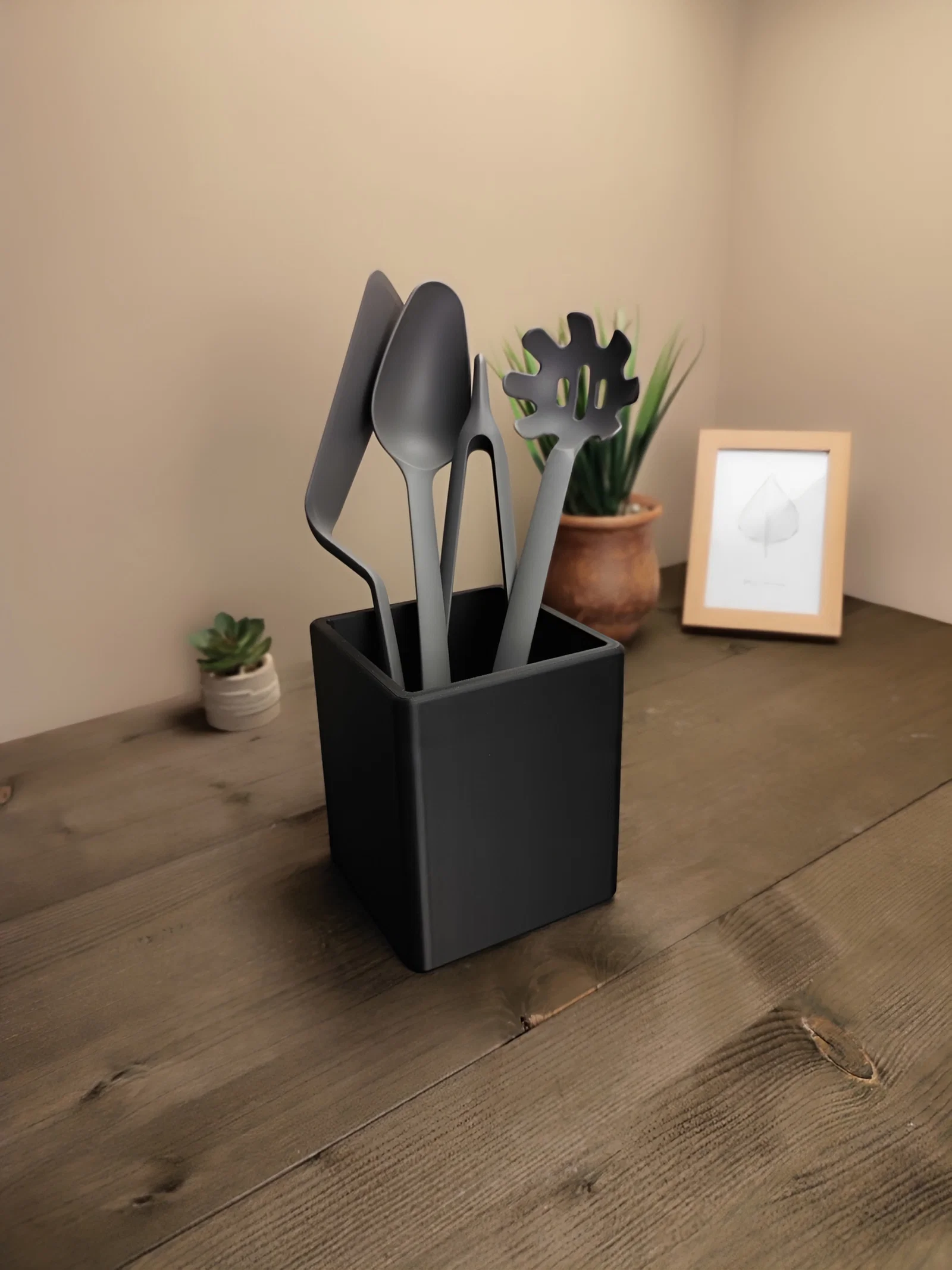 Ống đựng dụng cụ nhà bếp tối giản, kiểu dáng sang và bền dáng, vừa trang trí vừa tiện sắp xếp. Kích thước chuẩn 110×110×130mm, có thể scale lớn/nhỏ tùy nhu cầu và rất dễ in.