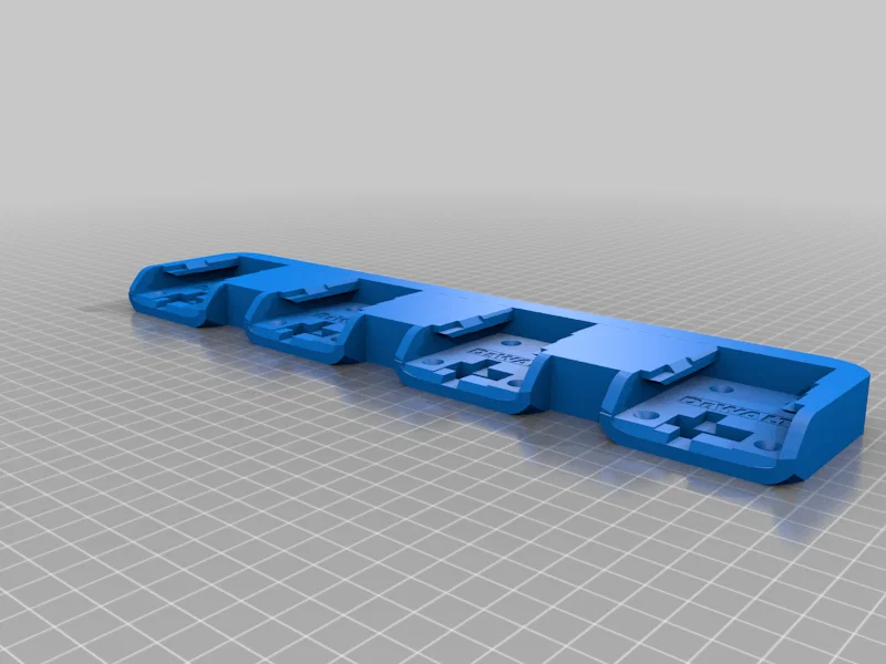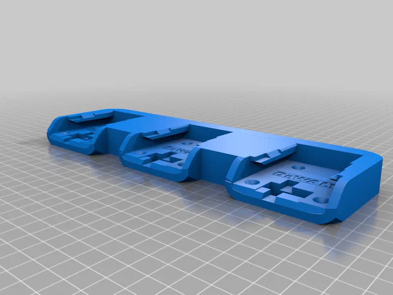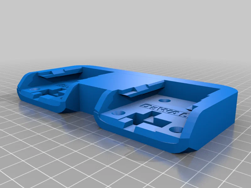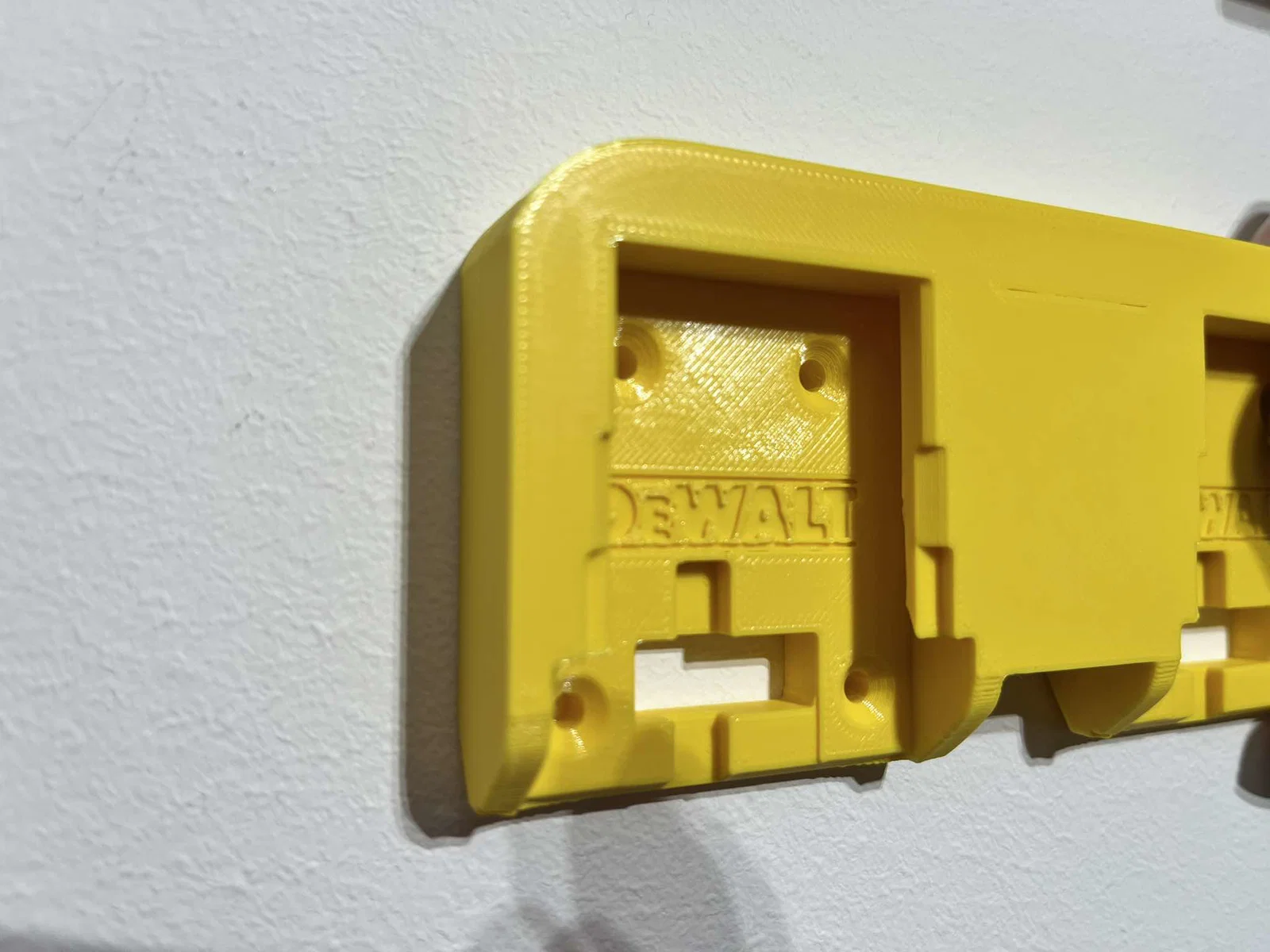 Mẫu giá treo tường/ốp tường cho pin DeWalt 12V, thiết kế cứng cáp và gọn gàng, có logo DeWalt ở mặt trên. Phù hợp in PETG/PLA, khuyến nghị infill từ 25% và dùng supports.