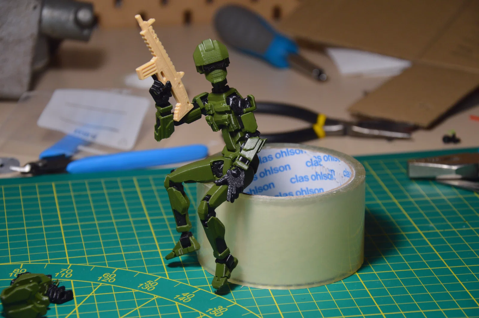 Helmet - Một phần đầu custom cho Dummy 13, có mũ composite, kính tactical và tai nghe tactical. In mặt sau nằm phẳng trên bed kèm supports, dùng bút lông đen tô thêm cho kính ngầu hơn!