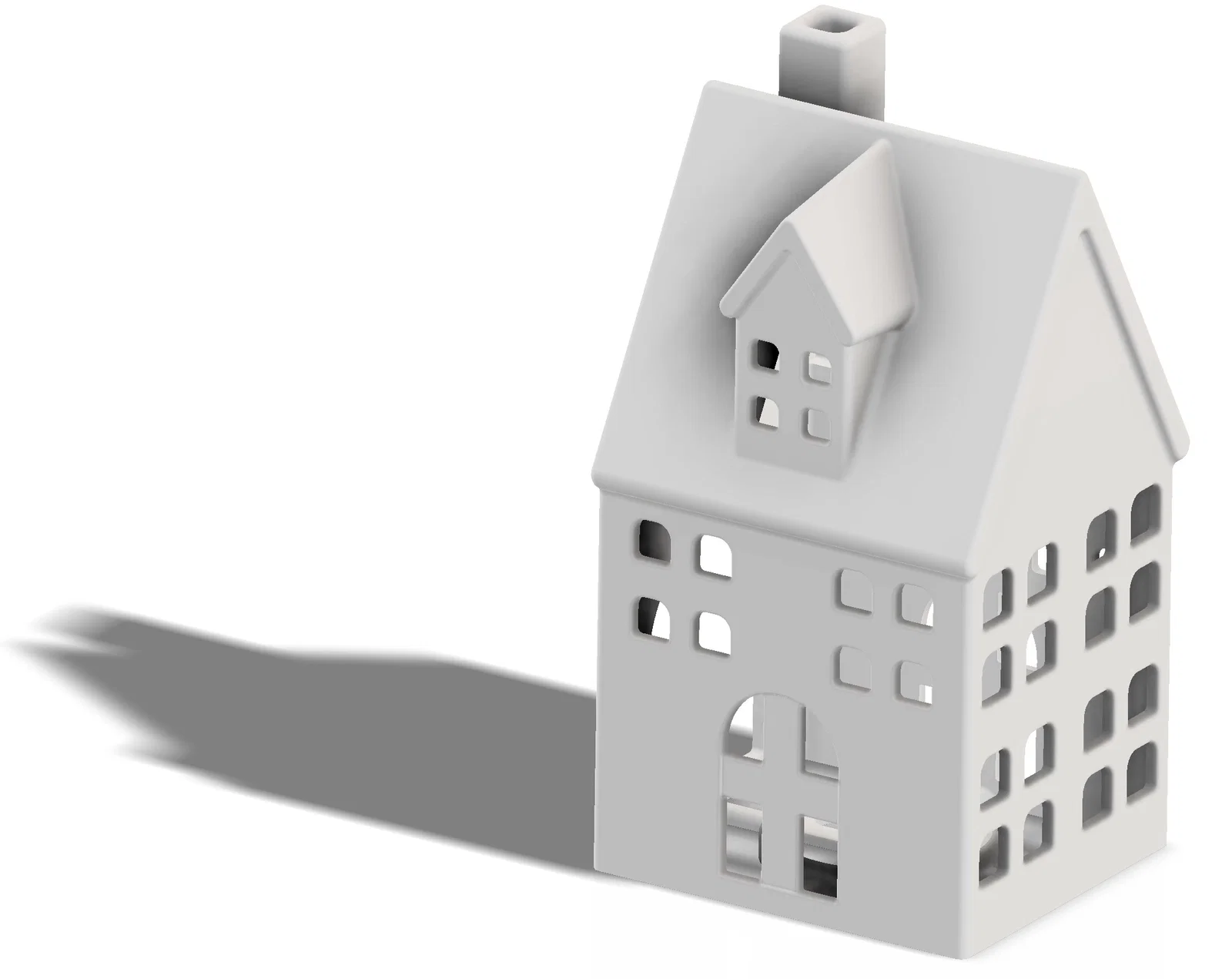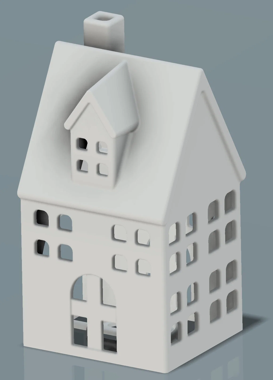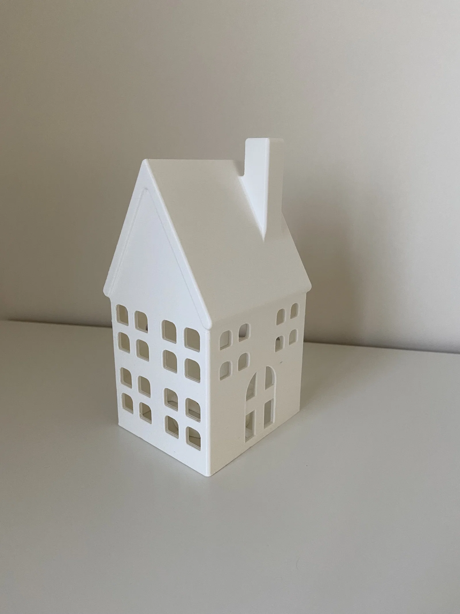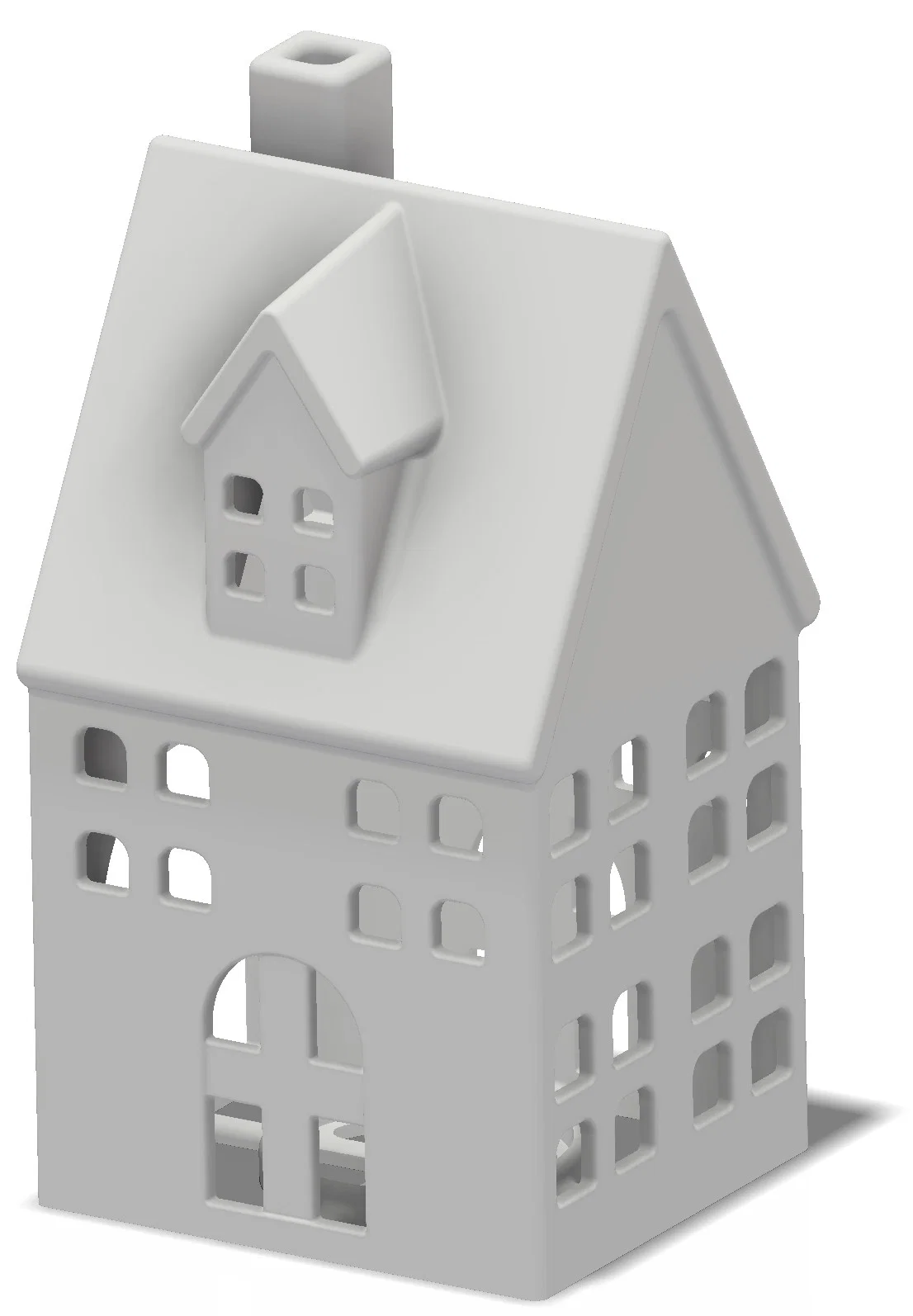 Mẫu “Middle house with tea light holder” cao 150mm, thiết kế để đặt đèn LED bên trong cho hiệu ứng ánh sáng đẹp mắt, phù hợp trang trí Noel. Lưu ý: không khuyến nghị dùng nến thật; có thể cần supports khi in.