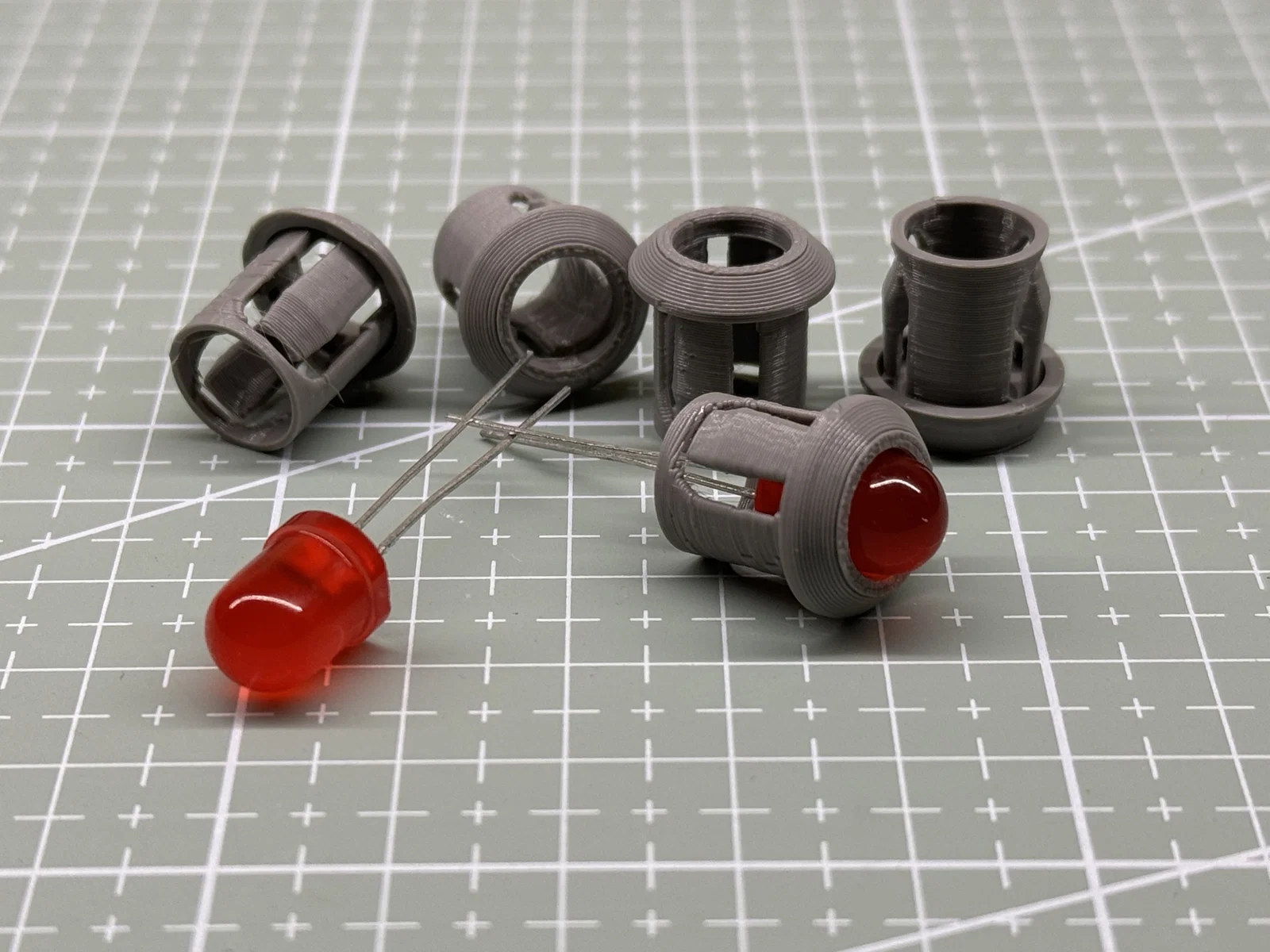 Ngàm 8mm LED Holder có lẫy khóa giúp giữ LED chắc chắn, không bị đẩy lùi vào mount. Lắp vừa lỗ 11.5mm (dày vật liệu tối thiểu 1.5mm). In 0.4 nozzle, layer 0.12–0.2mm, không cần support.