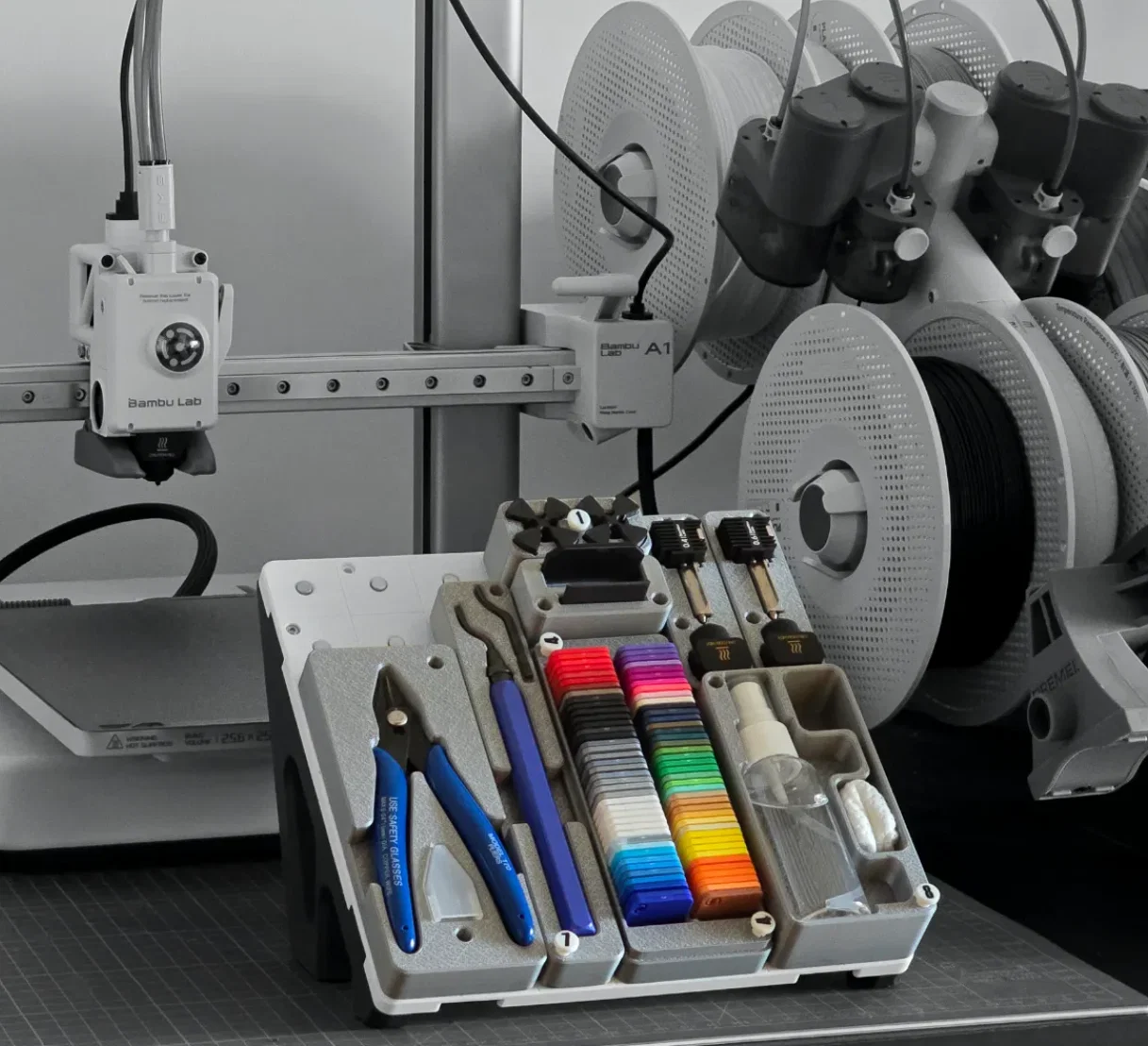 Vậy ở đây bạn có một cái stand để đặt dụng cụ cạnh máy in, giúp giữ những món bạn đang cần dùng ngay lúc đó. Các module có thể thay đổi và di chuyển tùy theo nhu cầu.