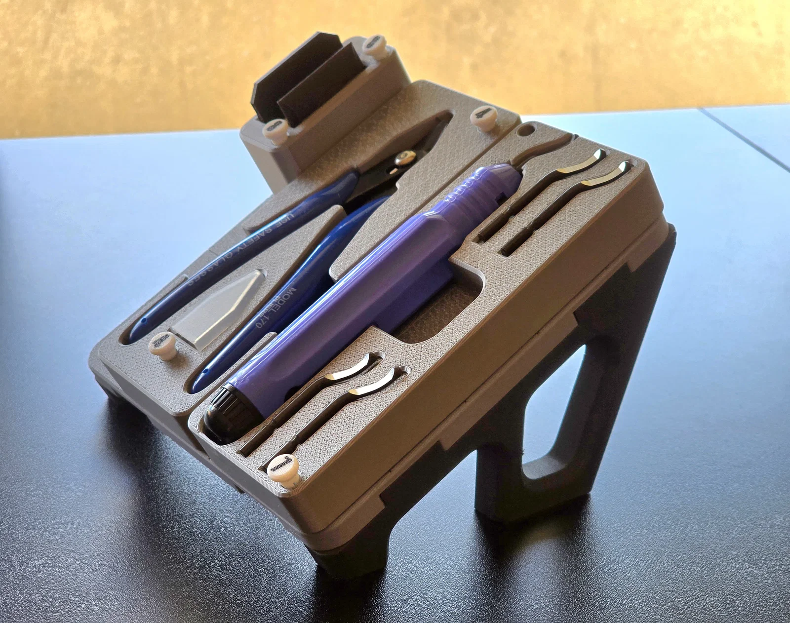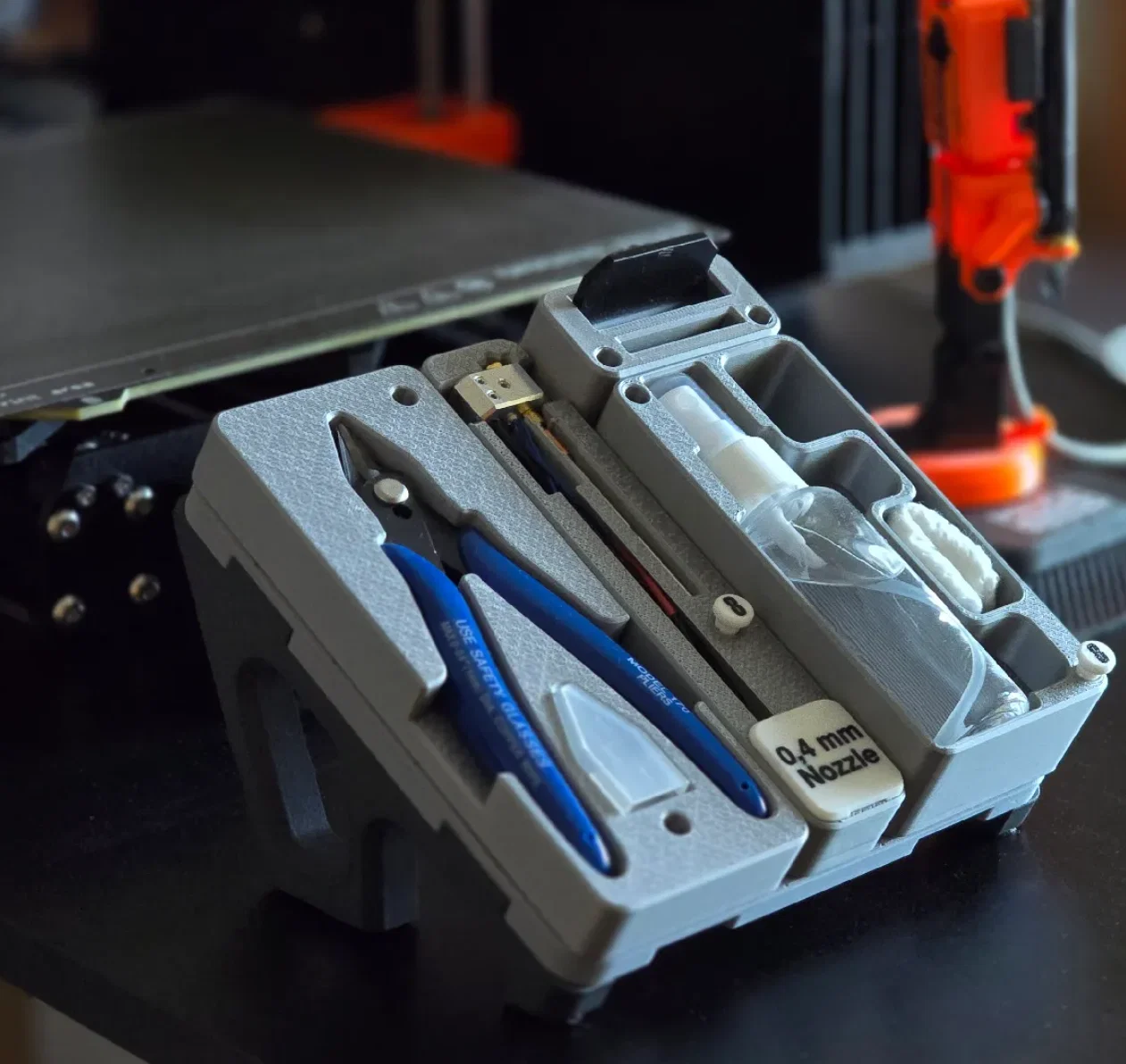 Đây là thêm một ví dụ nữa về rất nhiều thứ có thể làm với các module. Dụng cụ được giữ rất chắc cùng với phụ kiện của nó nhờ độ khít vừa vặn, hoặc trong một số trường hợp là nhờ nam châm (khi dùng được). Sẽ không bị rơi ngay cả khi in tốc độ cao…