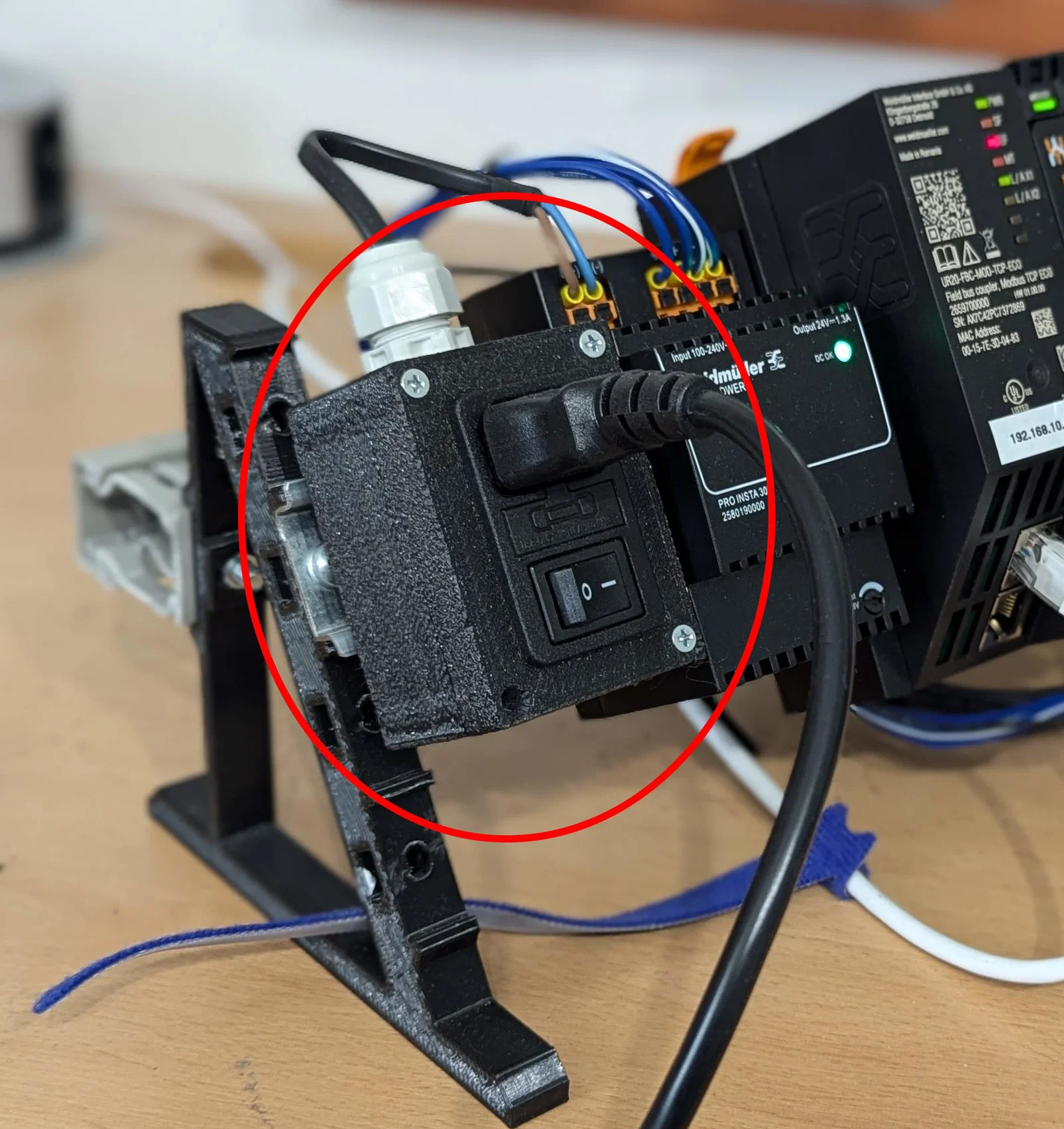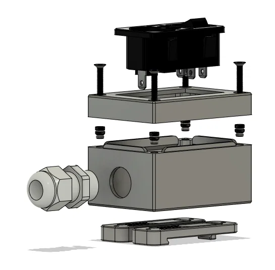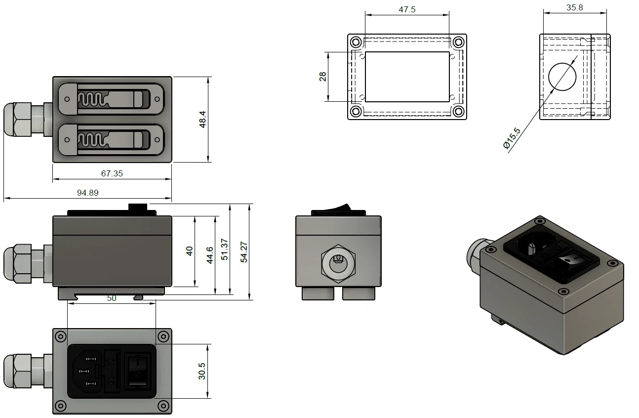Hộp vỏ gắn DIN rail cho IEC C14 power entry module có công tắc và cầu chì. File in trong Switch Box DIN Rail.3mf, dùng DIN rail brackets của Fabian. Khuyến nghị in PETG; có kích thước phần khoét IEC và PG9.