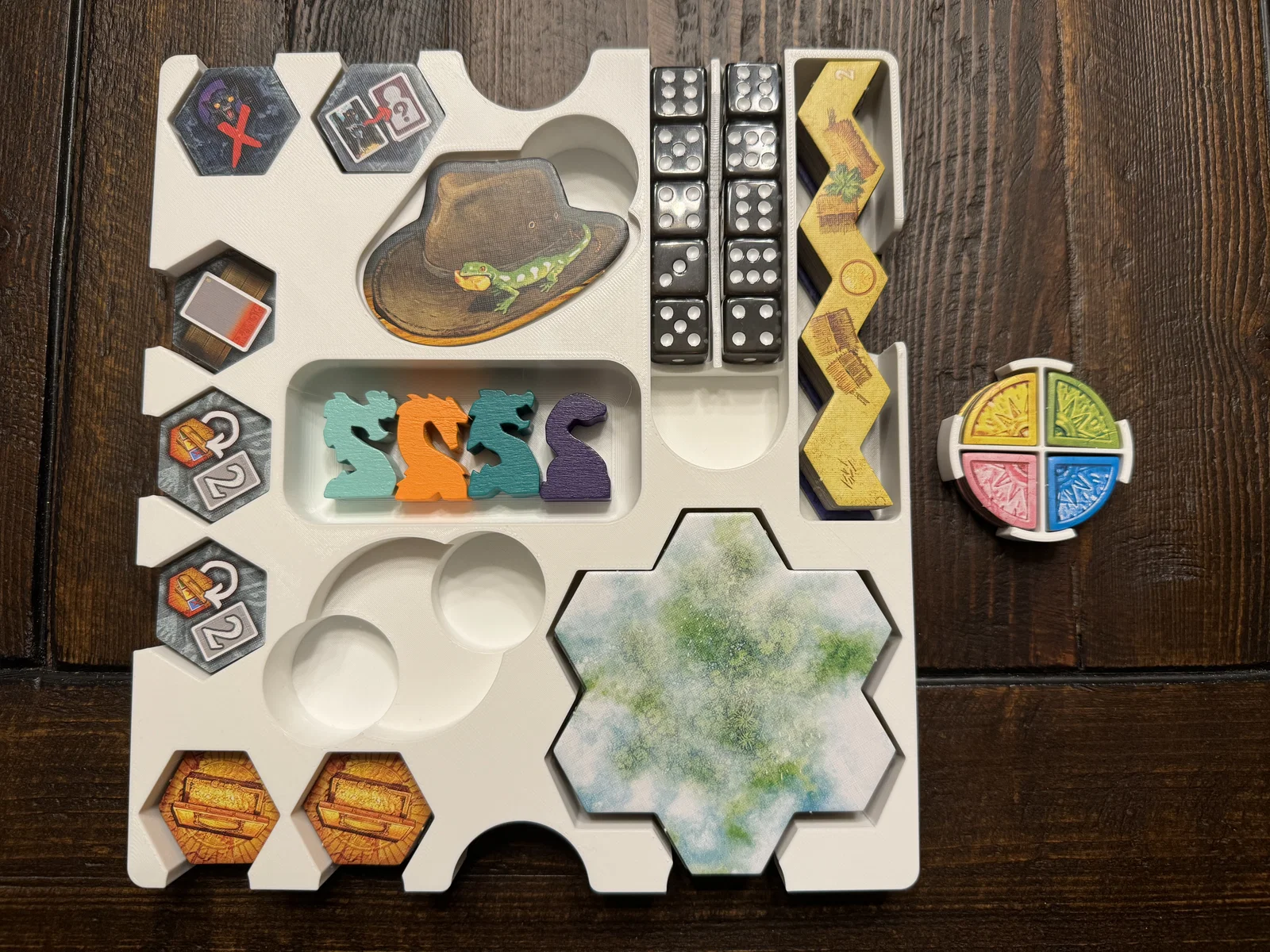 Gems trong một khay/holder rời. Nếu chơi với gems từ expansion Dragons, Treasures, & Mysteries, bạn có thể nhấc phần “bánh xe” tròn khỏi khay này và đặt lên bàn.