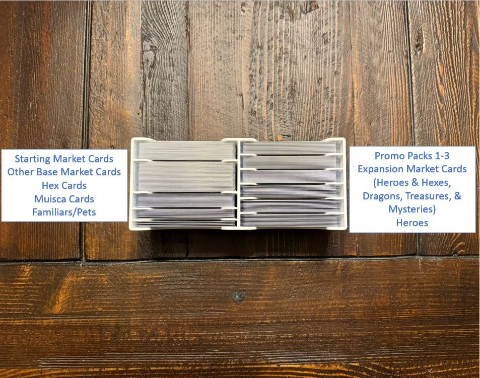 Cave tiles từ expansion Heroes & Hexes và Dangers & Muisca. Mình không phải lúc nào cũng chơi kèm các expansion này, nên mình chừa sẵn chỗ để tách riêng cave tiles của chúng trong khay. Khi chơi kèm, có thể trộn chúng vào túi cave tiles màu xám.