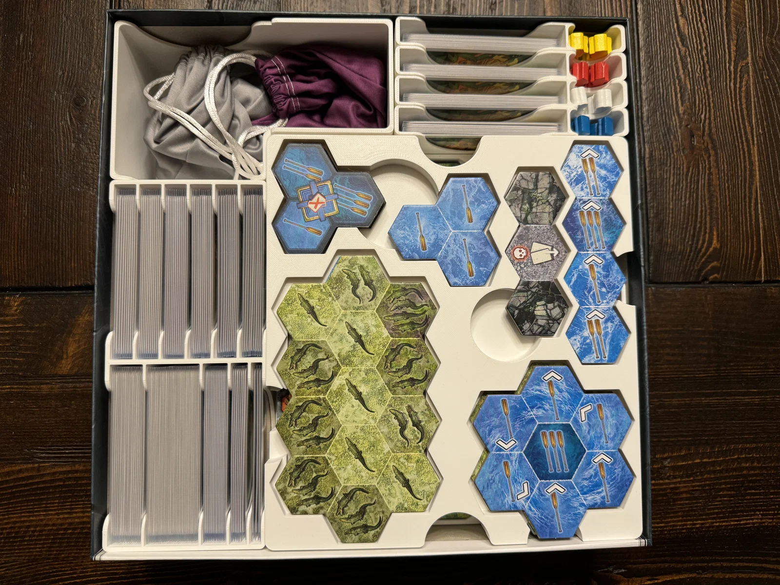 Khay setup thứ hai chủ yếu để đựng các map overlay tiles. Các tile hero camp và El Dorado được đặt bên dưới các tile to hơn dạng alligator/dangerous location.