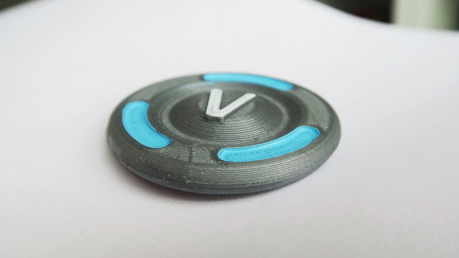 - Tùy chọn đa màu: Như trong hình minh họa, bạn có thể in từng phần riêng biệt rồi ghép lại hoặc sử dụng công nghệ in đa màu để làm nổi bật các rãnh màu xanh và logo chữ V.