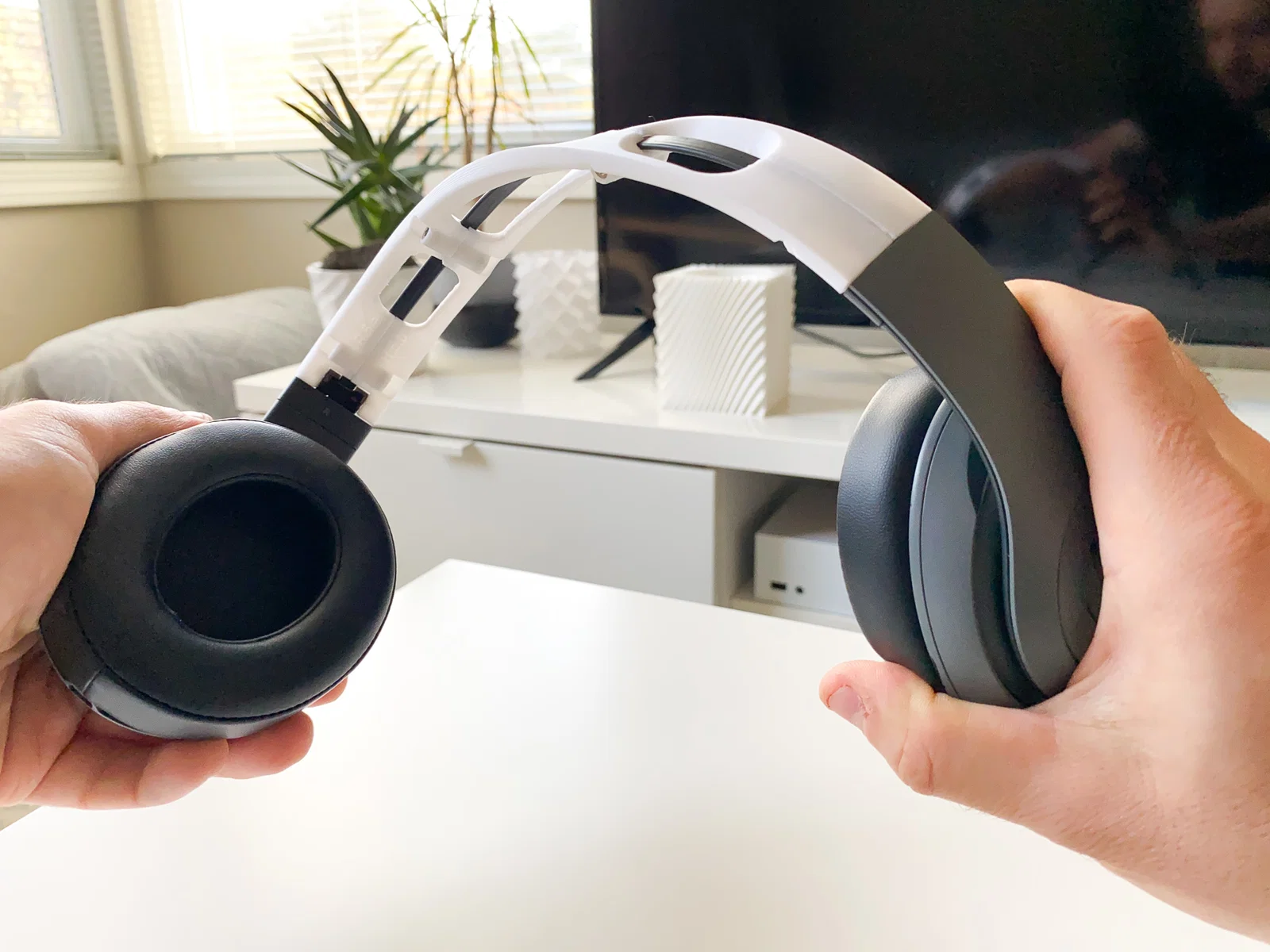 Bạn cần tháo headband zin và các miếng kim loại nhỏ quanh khớp gập thì mới lắp được headband này. Cẩn thận đừng làm hư sợi dây dẹt nối giữa hai bên loa.