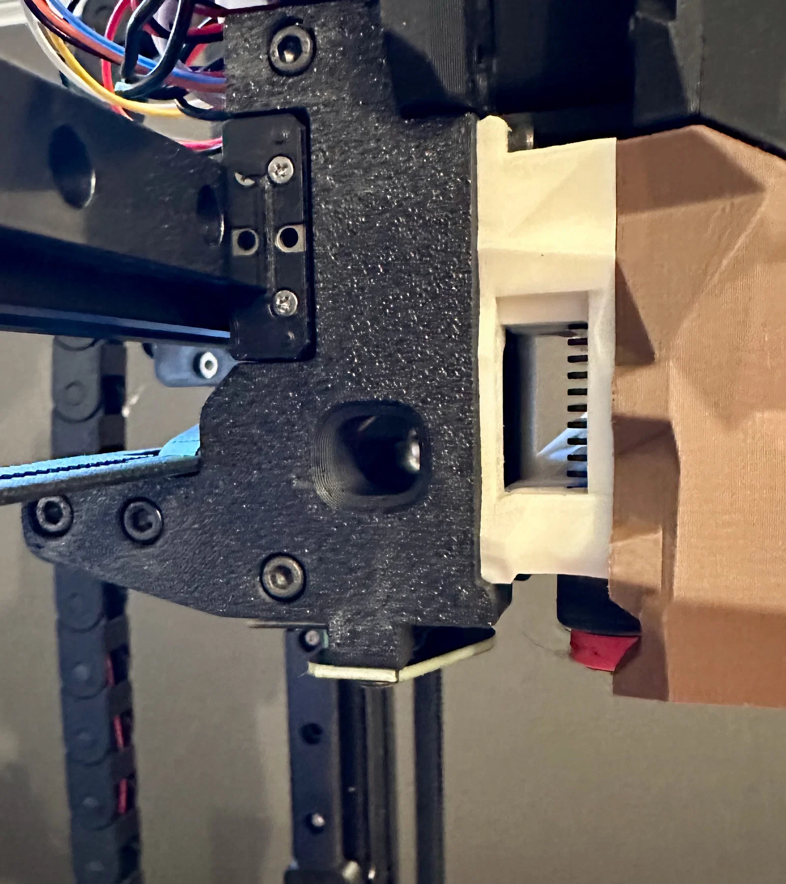 Bộ ngàm cần thêm 2 heatset insert gắn vào mặt dưới của carriage, và có sẵn khoảng hở để đi dây lên theo đúng các rãnh chung với dây x endstop và các ngàm probe thông thường. Dùng kiểu Cartographer probe “normal”. Tất cả chi tiết được in theo standard Voron settings: carriage in cùng hướng như mặc định, còn belt grippers mới thì in với mặt dây đai úp xuống (belt side down). Theo thiết kế, vị trí ngàm sẽ cao hơn đầu nozzle khoảng 2.7mm vì được canh theo revo hotend.
