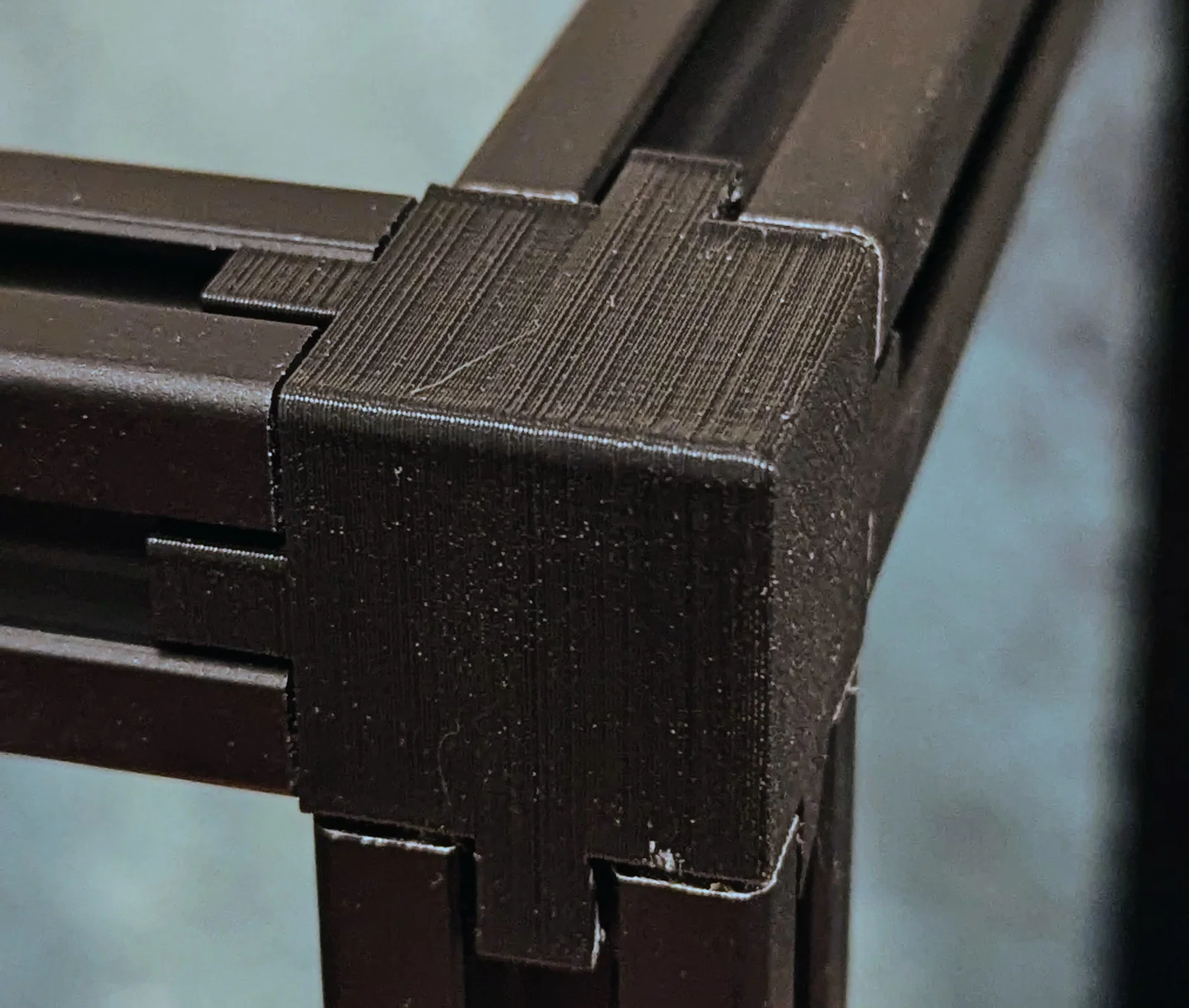 Thiết kế end cap/bát góc 3 hướng để ép lắp (press fit) vào 3 thanh nhôm định hình 2020 vuông góc, loại rãnh 5mm. Khuyến nghị in PETG, layer 0.2mm, infill 15%, wall 1mm.