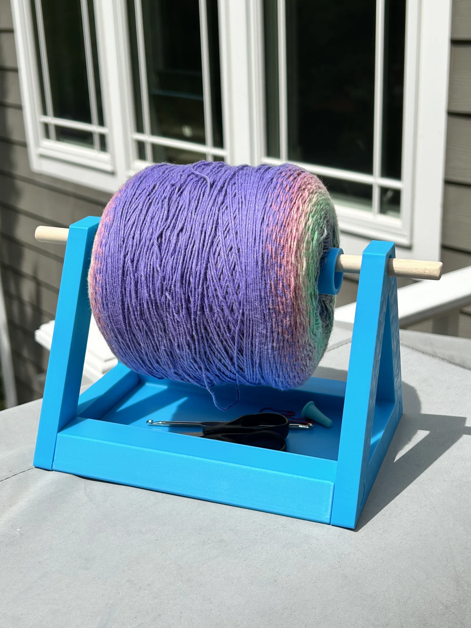 Mẫu Yarn Holder dạng nằm ngang, thiết kế đơn giản gồm đế và 2 miếng bên hông ráp bấm khớp. Inner spool quay trên dowel 3/8 inch để bảo vệ cuộn len. Gợi ý thông số in PLA: 4 perimeters, 20% infill; inner spool 15%.