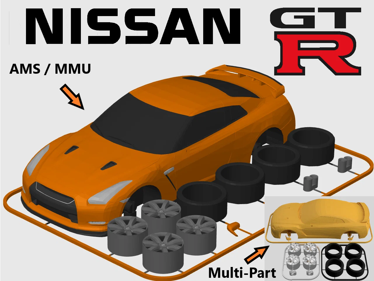Mẫu Nissan GT-R R35 dạng kit card tỉ lệ 1:24, có khớp nối tích hợp để lắp ráp sau khi in. Có STL in 1 màu và 3MF set màu sẵn cho AMS/MMU. In layer 0.15mm, không cần supports.
