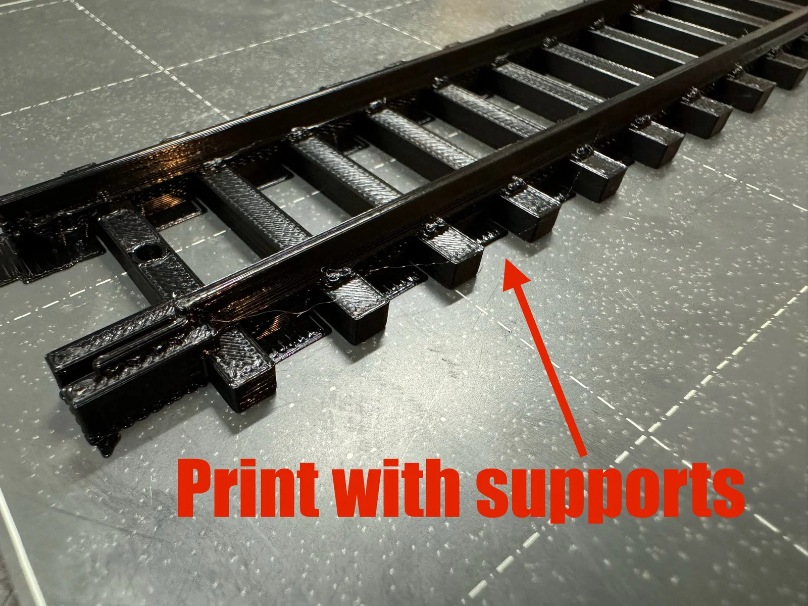 Mẫu này cần in có supports ở bên dưới phần rails và các đầu nối, nhưng bạn sẽ cần chặn supports ở phía bên trong các đầu nối. (Các đầu nối vẫn ra đẹp mà không cần supports bên trong)