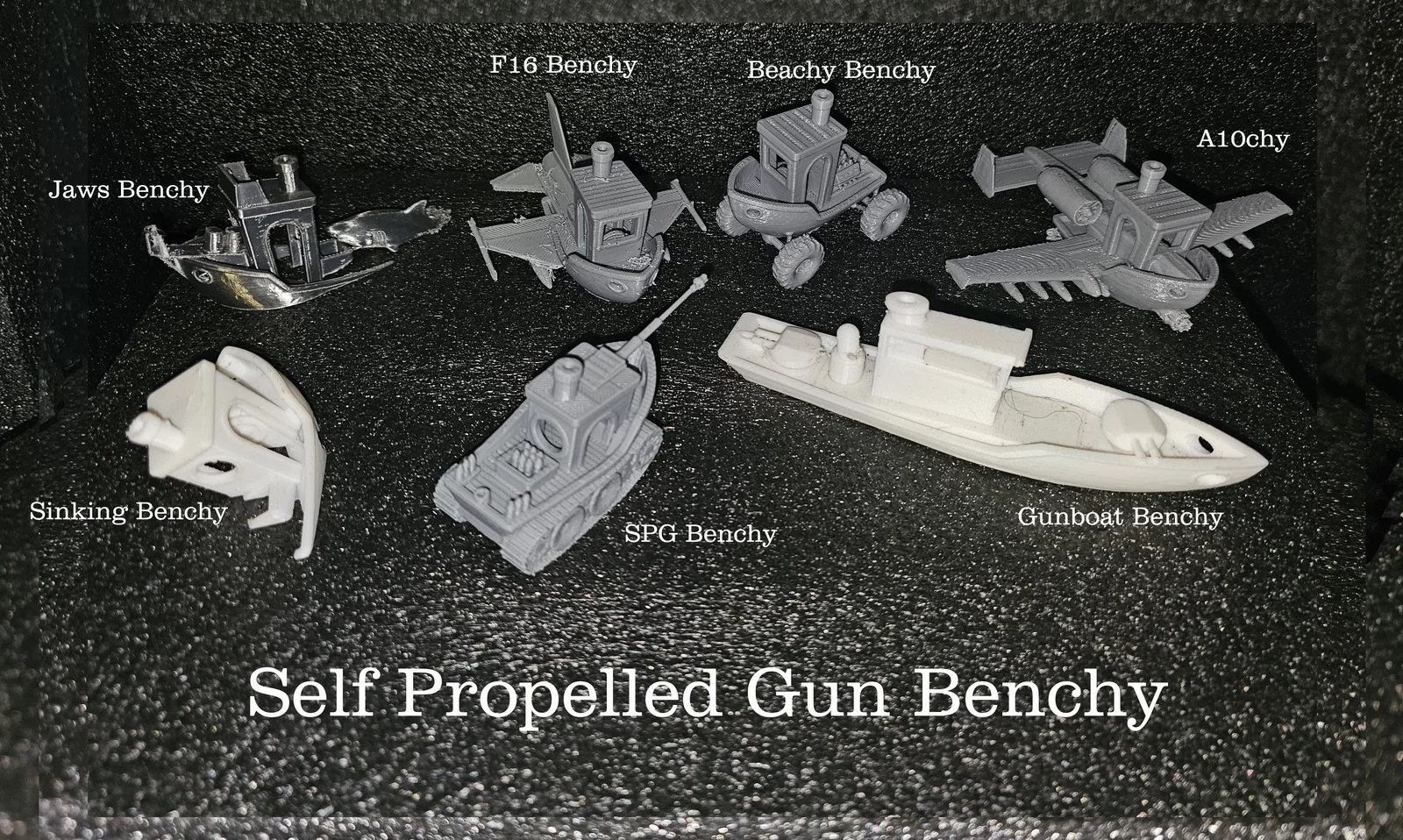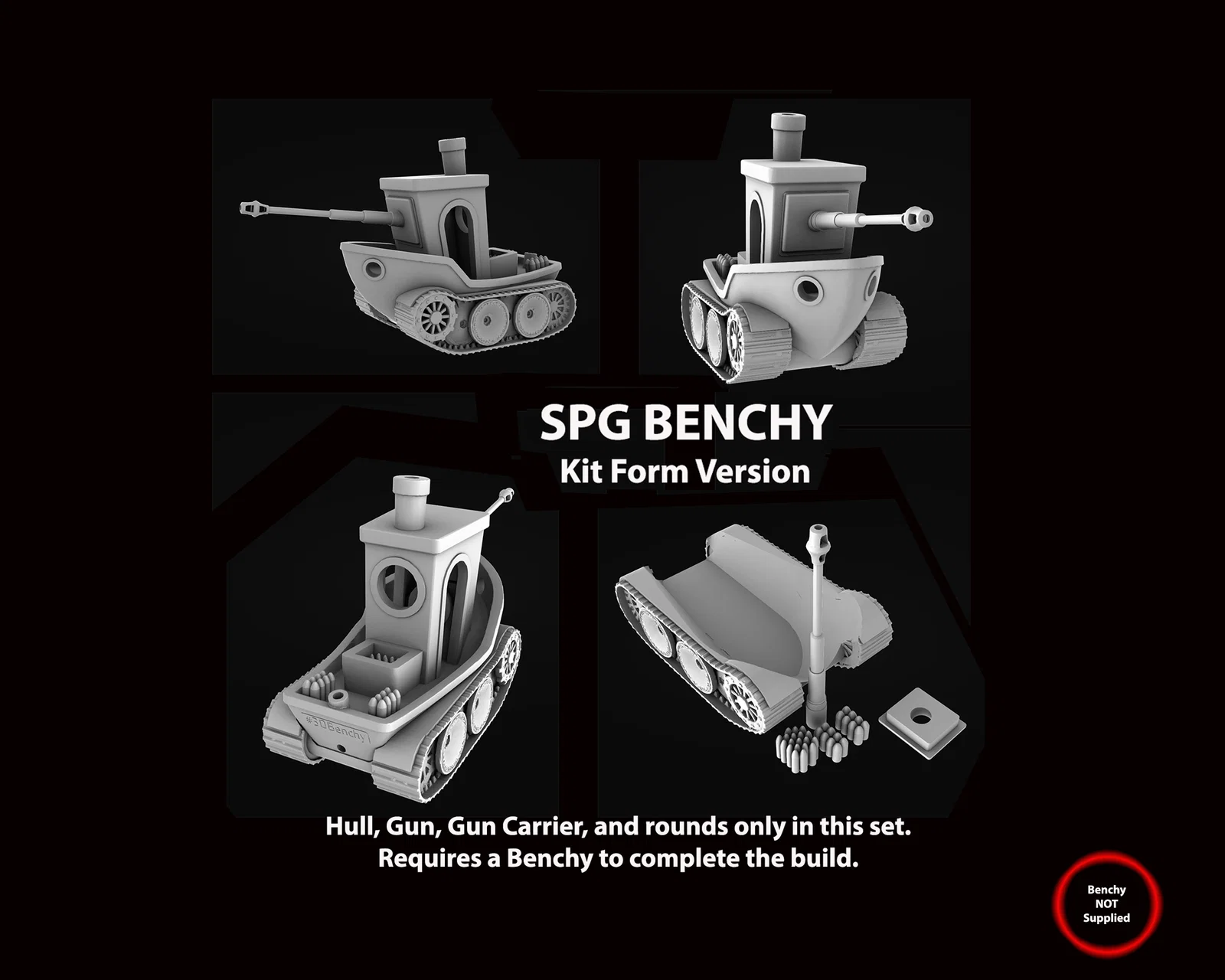 Bộ phụ kiện để biến Benchy của bạn thành phiên bản SPG (self propelled gun). Không kèm Benchy; chỉ có Hull, tracks, gun mount gắn cửa sổ, gun và các file projectile. Cần dùng Benchy stock của bạn để lắp.