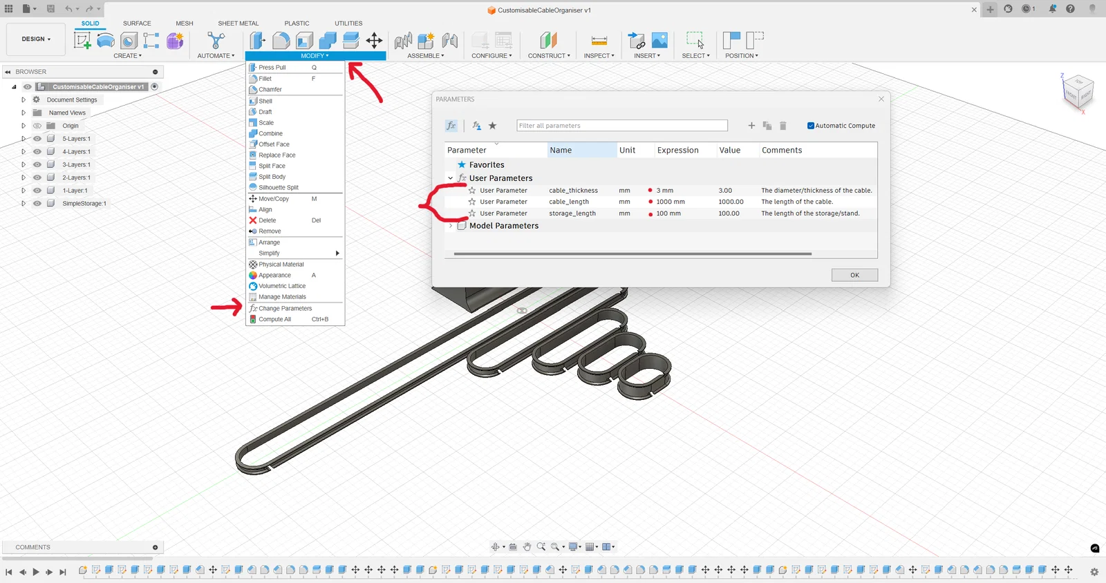 Đã phát hiện lỗi ở cả bản thường và bản dài của Customizable Cable Organizer khiến Fusion360 làm hỏng model.