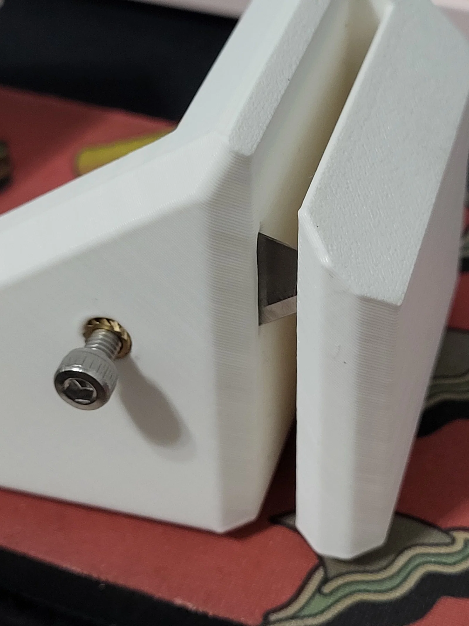 Một người bạn muốn có dụng cụ cắt dải bìa carton để làm bàn cào móng cho mèo. Mình có tìm được một mẫu ở đây nhưng nó cần support khi in, nên mình quyết định chỉnh lại (thật ra là thiết kế lại) để có thể in không cần support. Mẫu này cần một threaded insert (mình dùng M4) để không phải dựa vào ren trực tiếp trên nhựa.