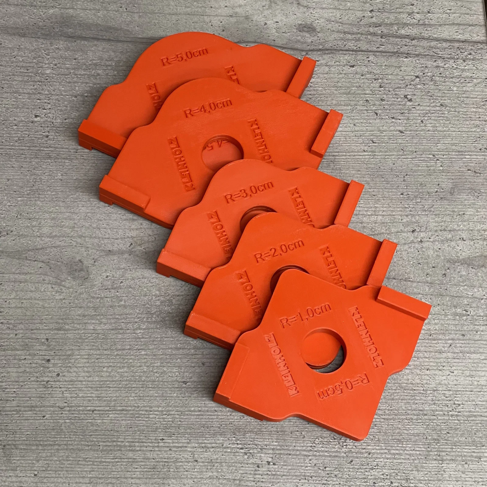 Bộ cữ giúp phay bo bán kính gỗ nhanh và dễ khi dùng Oberfräse (router) với mũi flush trim bit có vòng bi dưới và router table. Mỗi cữ có 2 bán kính (dùng bằng cách lật), gồm các size 0,5–5,0 cm.