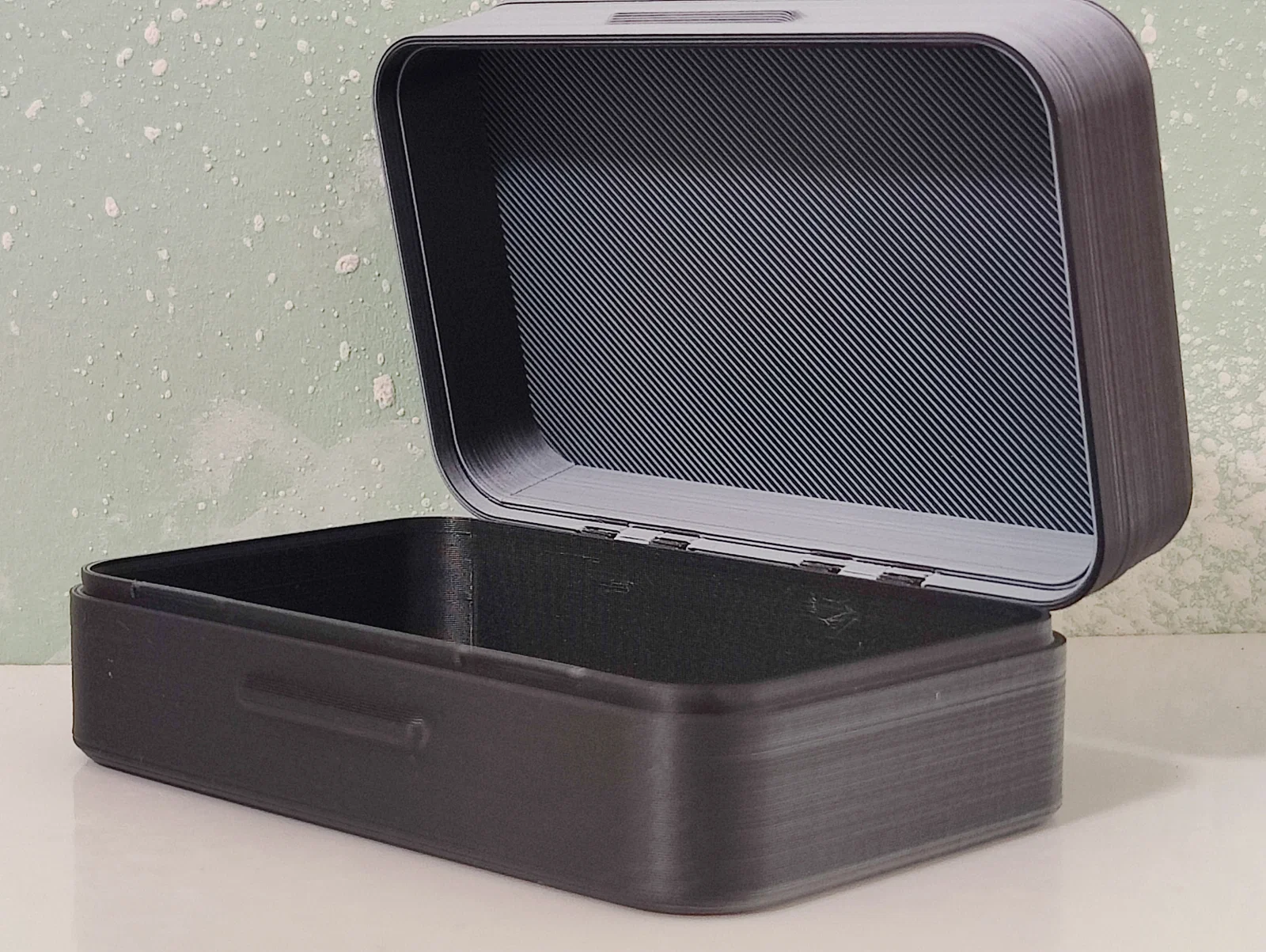 Hộp nhỏ dạng print-in-place, in xong là dùng liền không cần supports. Bản lề hoạt động tốt và nắp có cơ chế bấm đóng. Có bản v2 cập nhật bản lề và bản mới bỏ divots giữ nắp.