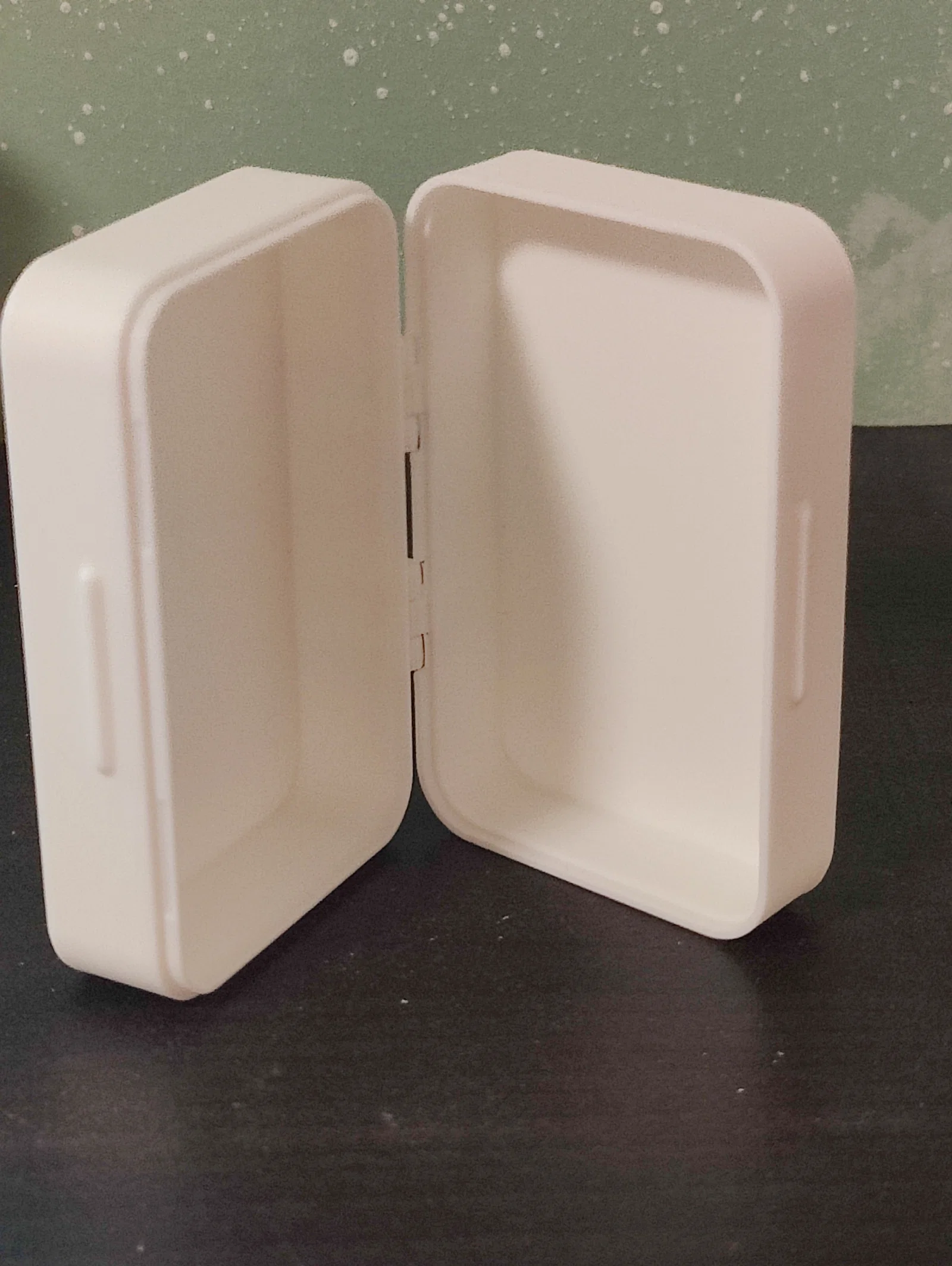 Một cái hộp nhỏ kiểu print-in-place. In không cần supports. Có bản lề hoạt động được và nắp bấm cái “tách” là đóng kín.