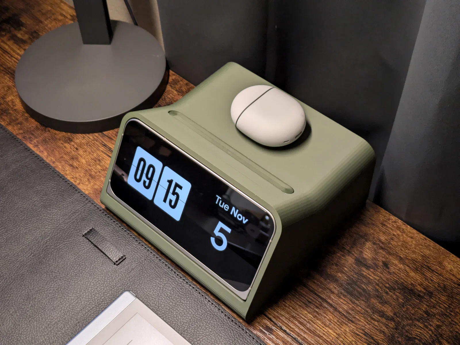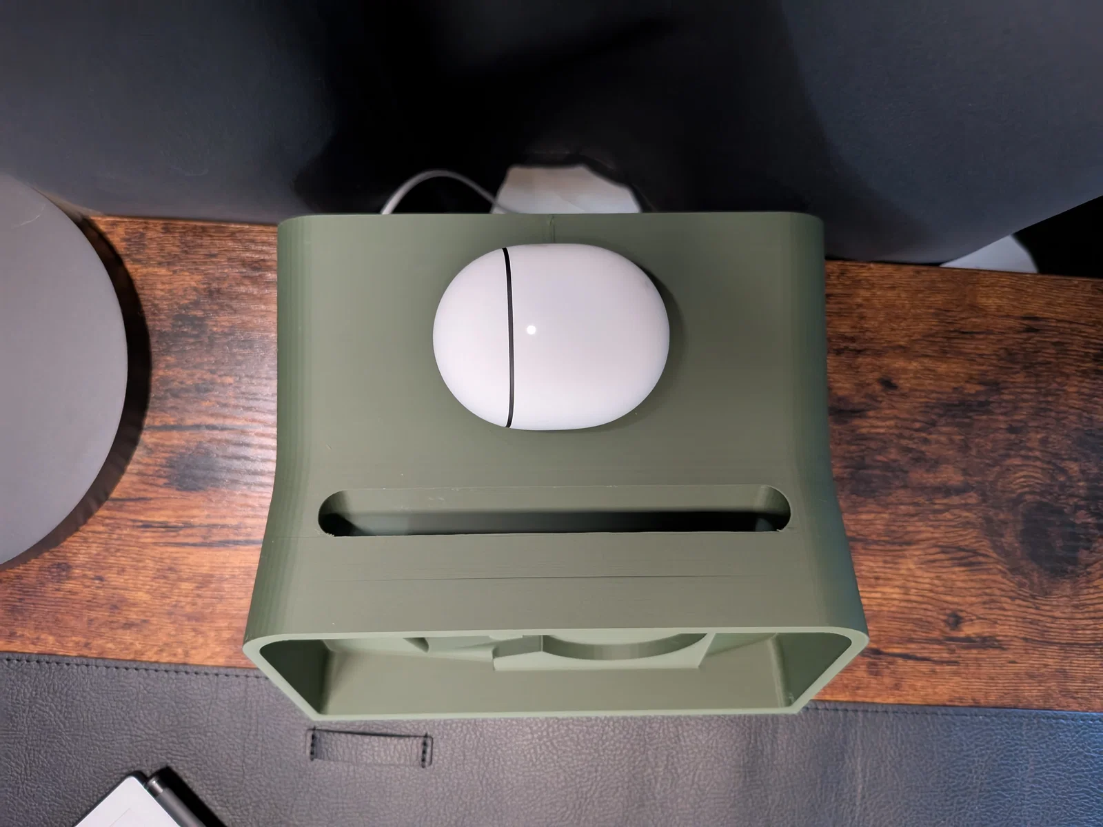 Chỉnh sửa đầu tiên mình làm là phần sạc AirPod bên trong. Mình biết nó được dùng vì kích thước gọn, nhưng tiếc là nó chỉ sạc được AirPods và Apple Watch (không dùng chuẩn sạc không dây Qi phổ thông). Nên mình đã chỉnh lại khoảng trống để lắp vừa Apple MagSafe charger bản full-size, mà không đổi kích thước bên ngoài. Nghĩa là “Top Space” giờ sạc được mọi thiết bị sạc không dây! Hình phía trên là Google Pixel Buds Pro 2 của mình đang sạc ở phía trên, nhưng bạn cũng có thể sạc thêm một chiếc điện thoại ở trên nếu muốn.