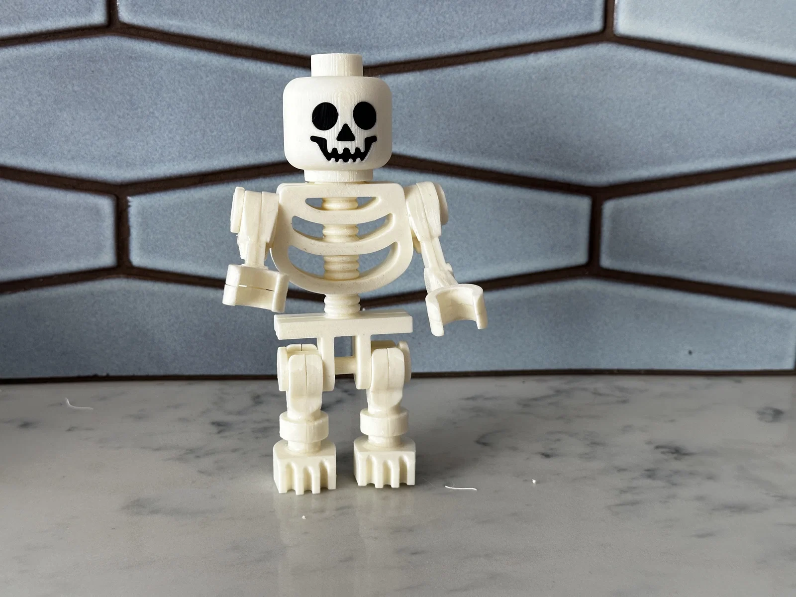 Mẫu Single Plate Print LEGO Skeleton (4:1) – Improved: in gọn trên 1 plate, chỉ phần skull cần supports. Các chi tiết còn lại dán keo và dùng filament 1.75mm làm chốt nối; mặt in không support và bấm vào vừa khít.