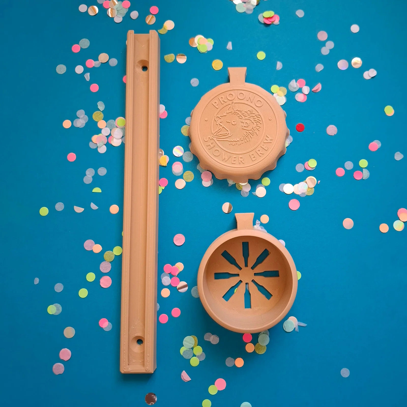Mẫu Shower Beer Holder with Cap “nổi tiếng” với guidance rail liền khối giúp trượt dẫn hướng ổn định. Clearances đã set sẵn; có thể scale rail +/-1% để vừa máy. Khuyến nghị gắn bằng vít hoặc cable tie.