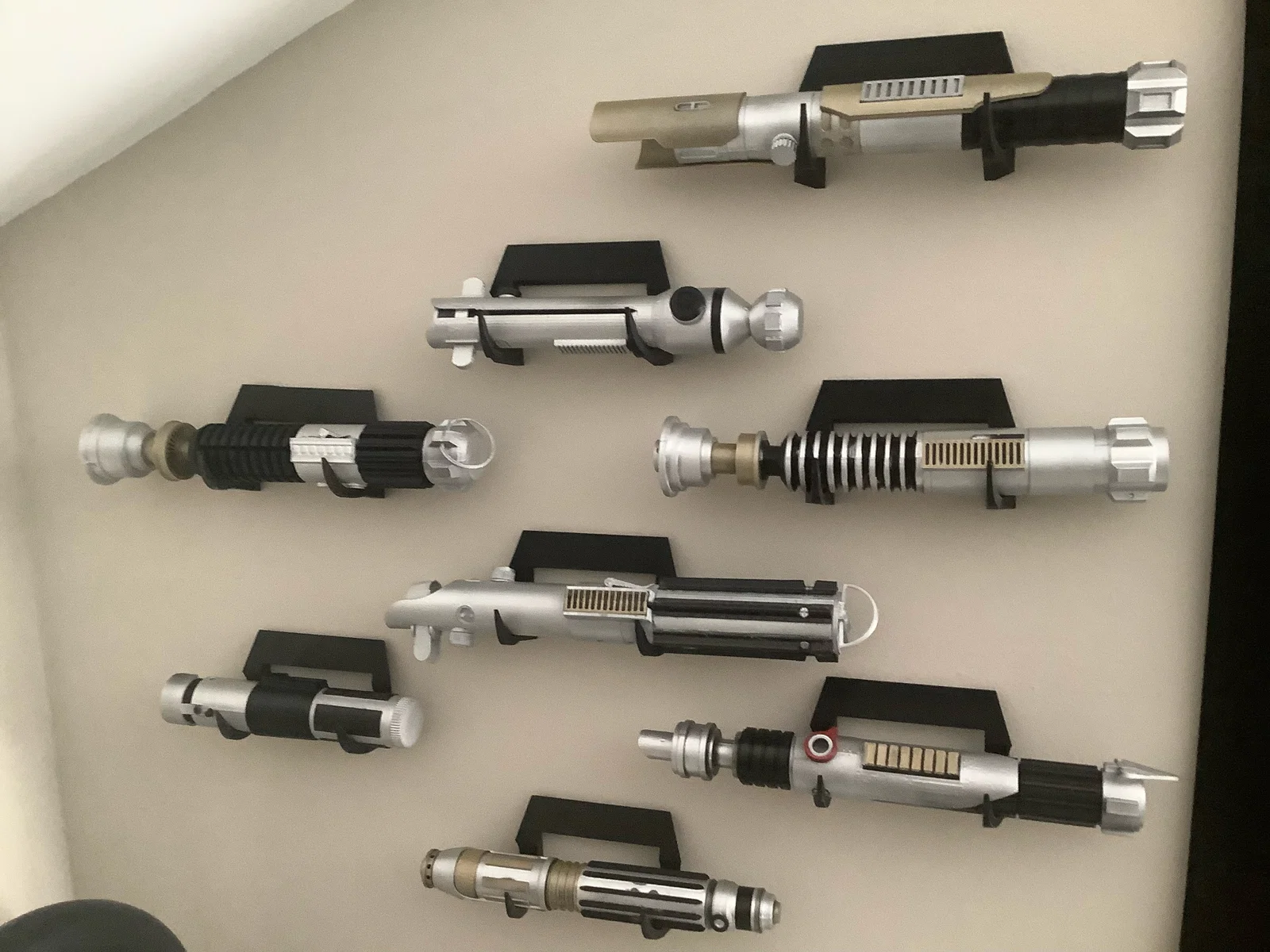Việc lắp đặt mẫu giá treo này cũng cực kỳ đơn giản và linh hoạt. Bạn có thể dễ dàng sắp xếp chúng theo nhiều bố cục khác nhau trên tường, từ việc treo dọc theo một đường thẳng cho đến kiểu sắp xếp phân tầng để tạo điểm nhấn thị giác. Nhờ cấu trúc hỗ trợ thông minh, các chiếc Lightsaber của bạn sẽ luôn nằm ở vị trí đẹp nhất, dễ dàng lấy ra để chiêm ngưỡng hoặc vệ sinh mà không lo bị trầy xước. Đây quả thực là món phụ kiện không thể thiếu cho những ai yêu thích việc trưng bày các món đồ sưu tầm.