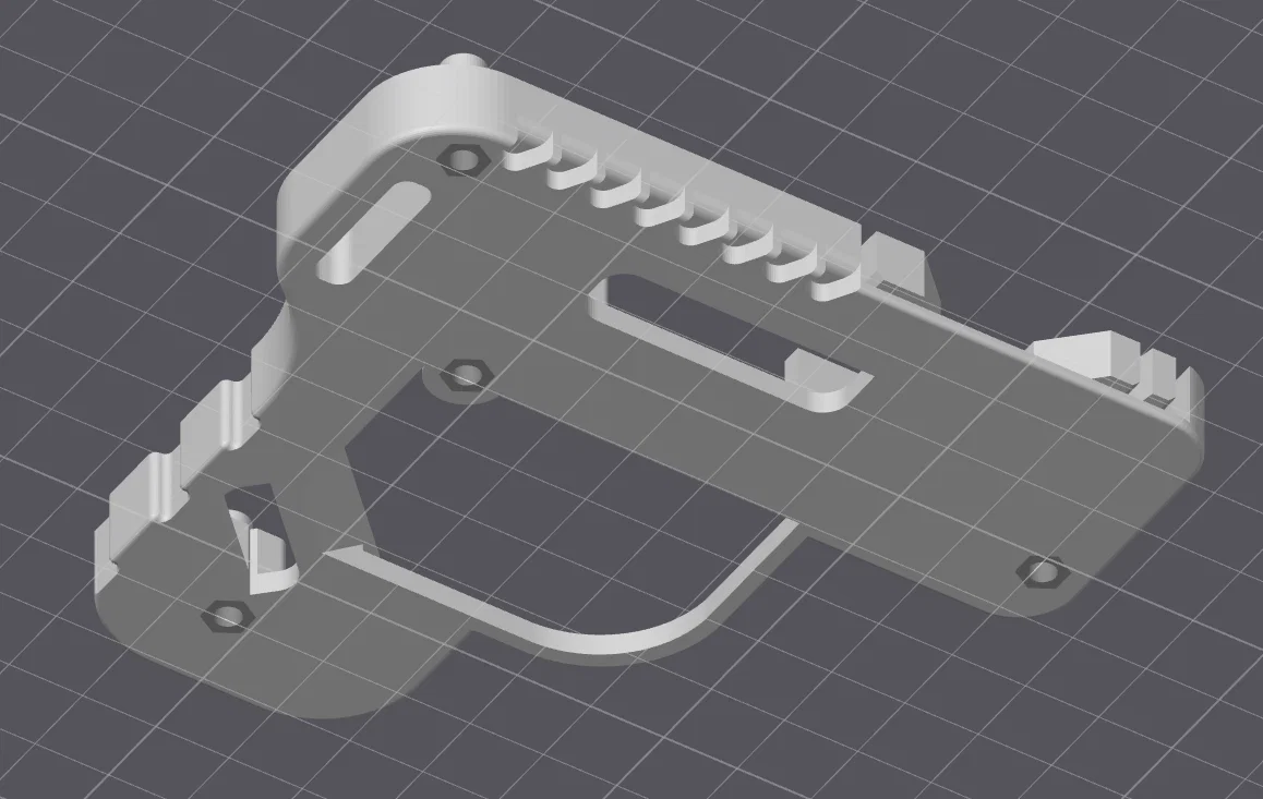 Nếu bạn muốn tự làm: nhấp chuột phải vào phần gun, chọn add negative volume, chọn Load, rồi chọn file m3-hexnut.step. Canh nó vào giữa từng lỗ bắt vít, và nhớ chỉnh sao cho nó chỉ vừa chạm nhẹ vào build plate.