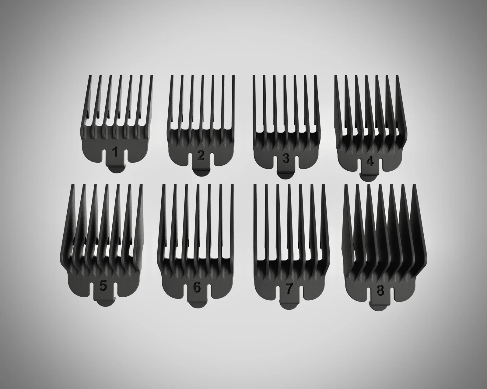 Bộ attachment/cữ lược tông đơ từ #1 đến #8, thiết kế parametric để thêm nhanh các cỡ. Làm để thay thế cho Wahl Precision Clipper MC2 (có thể hợp với mẫu khác). Khuyến nghị in PETG kèm supports.