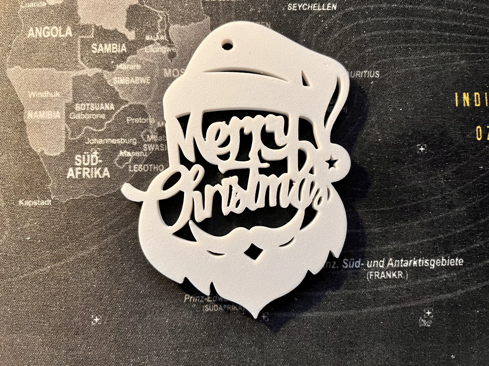 Ornament ông già Noel với chữ “Merry Christmas” được lồng vào bộ râu nhìn rất nổi bật, hợp treo cây thông hoặc trang trí quà tặng. Bạn có thể in nhiều màu/vật liệu khác nhau để tùy biến theo phong cách của mình.