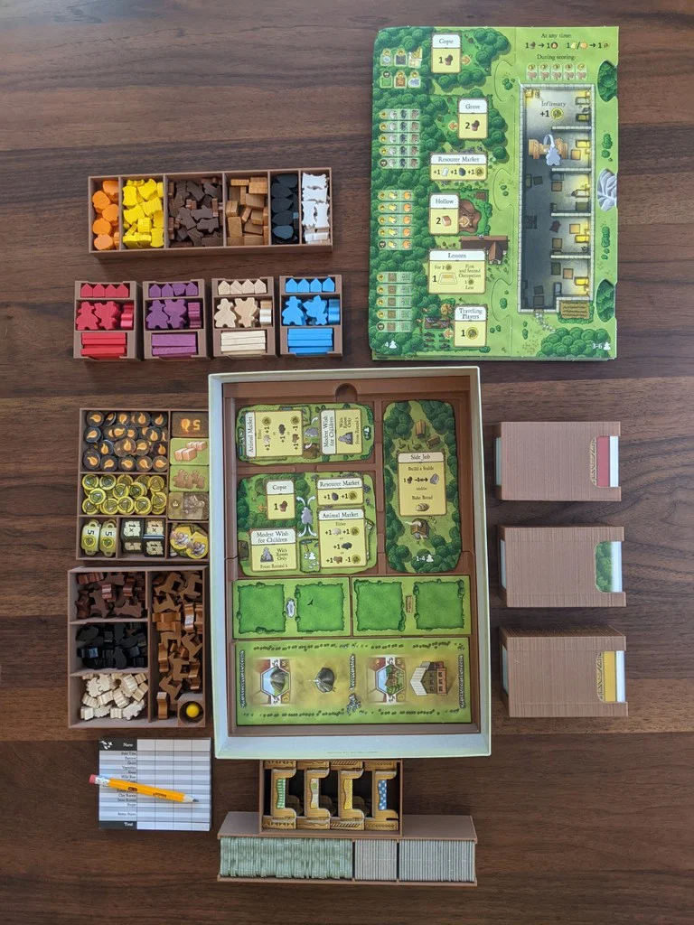 Phần duy nhất mình đã bỏ ra là 2 tấm “giường” bằng cardboard đi kèm expansion Farmers, vì mình không có expansion 5–6 người chơi. Có thể để đủ cả 6 tấm giường trong hộp, nhưng sẽ cần tháo rời chúng trước.