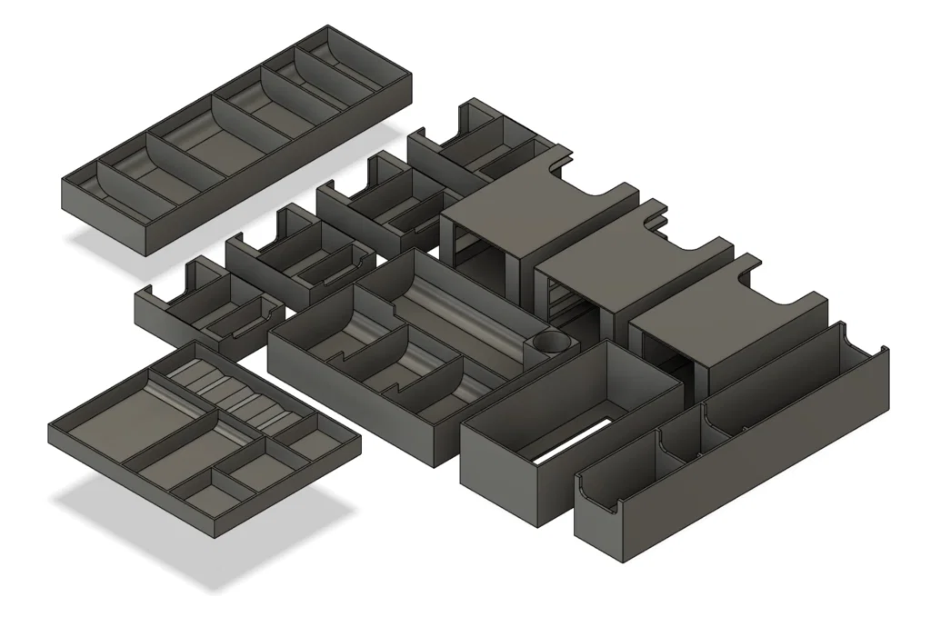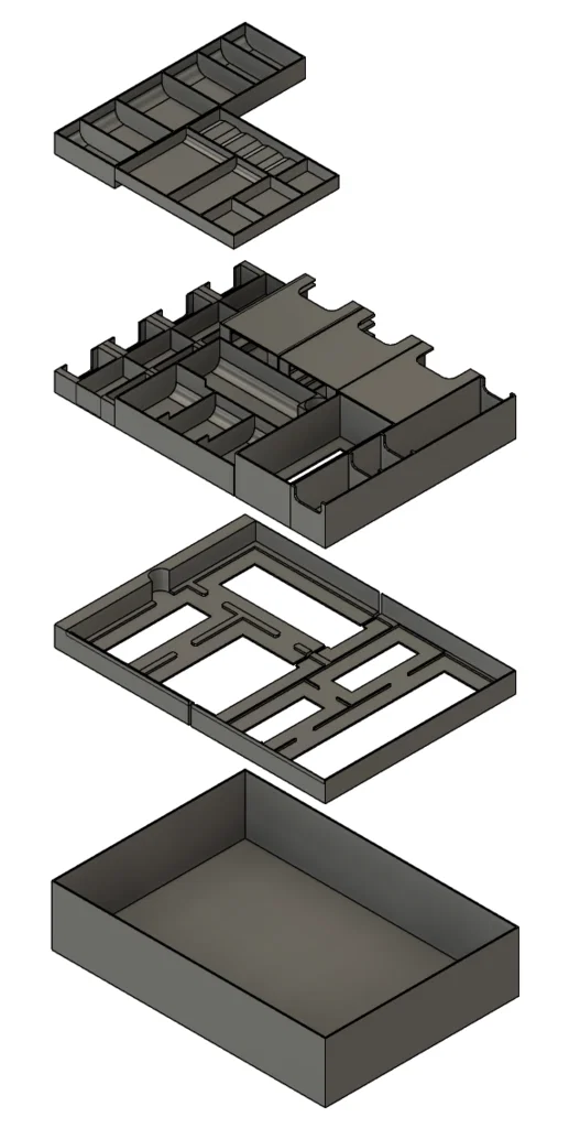 Các khay được thiết kế để có thể lấy ra khỏi hộp và dùng trực tiếp trong lúc chơi, giúp cả khâu set up lẫn dọn dẹp nhanh gọn hơn. Xem các hình đính kèm để biết cách sắp xếp toàn bộ các phần trong hộp.